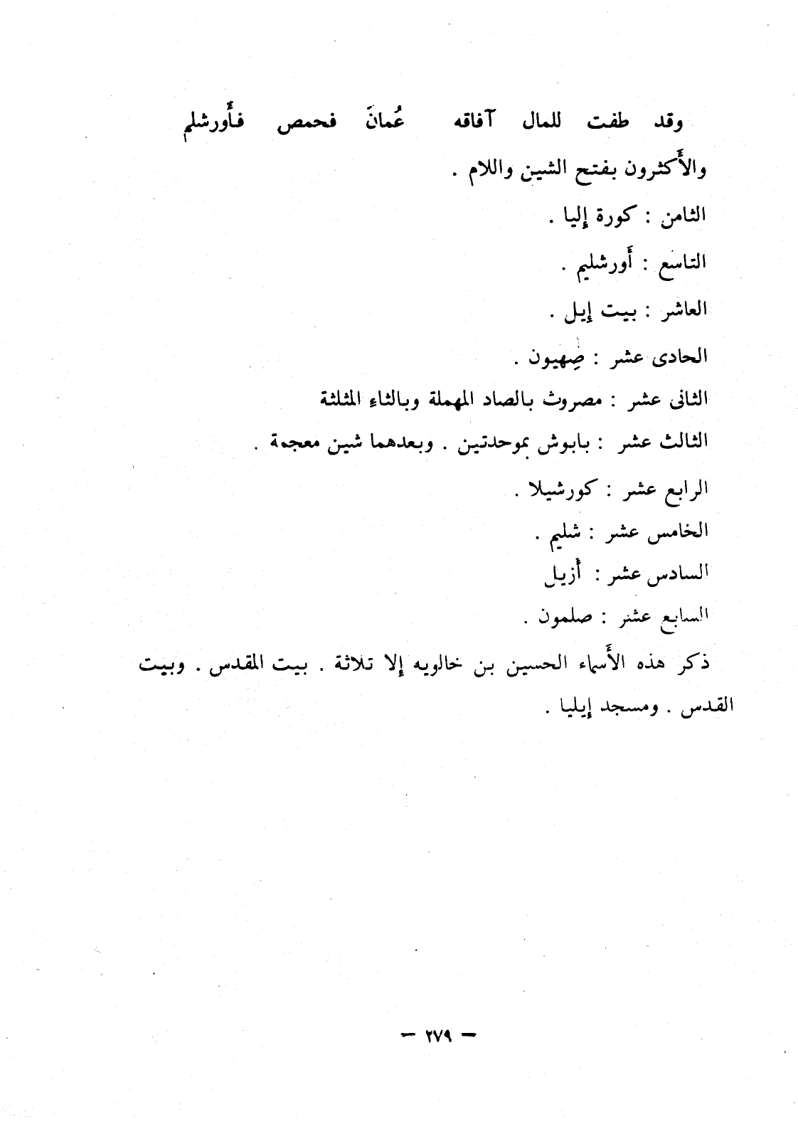 ذكر هذه الاسماء الحسين بن خالويه إلا ثلاثة. بيت المقدس. وبيت القدس. ومسجد إيليا.