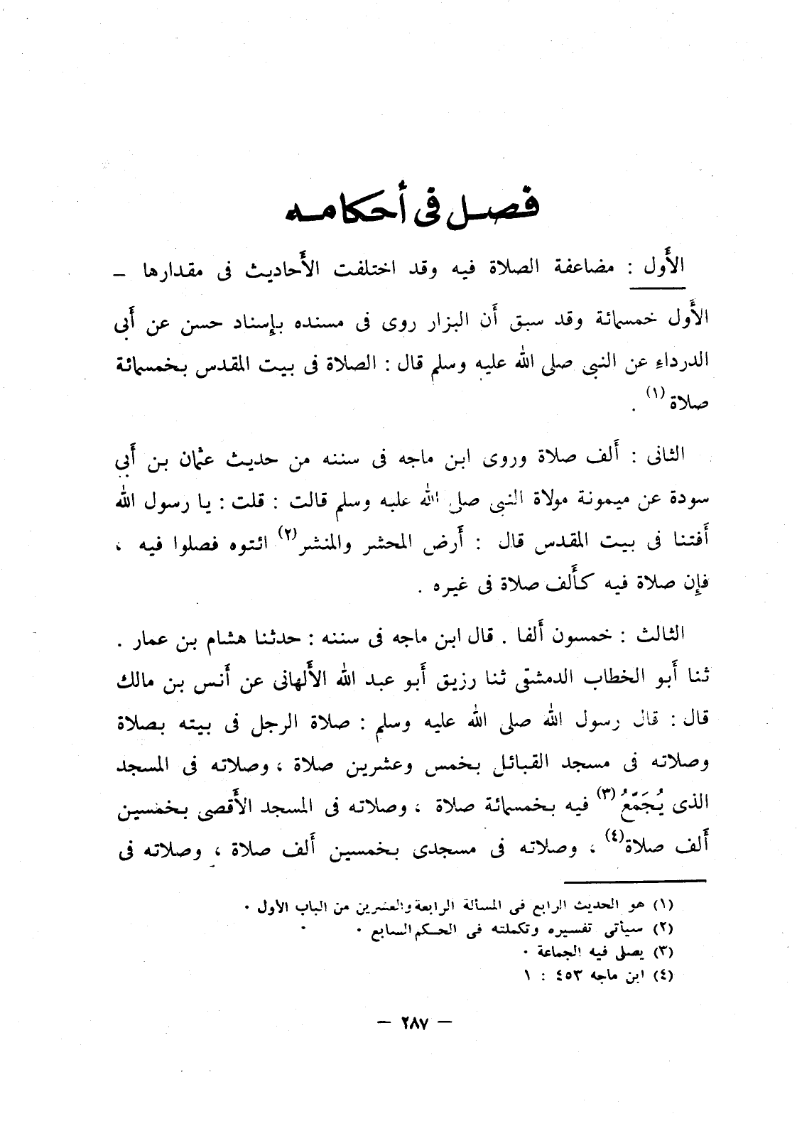 الثالث: خمسون ألفا. قال ابن ماجه في سننه: حدثنا هشام بن عمار ثنا أبو الخطاب الدمشقي ثنا رزيق أبو عبدالله الألهانى عن أنس بن مالك قال: قال رسول الله صل الله عليه وسلم: صلاة الرجل في بيته بصلاة وصلاته في المسجد القبائل بخمس وعشرين صلاة، وصلاته في المسجد الذي يجمع فيه بخمسمائة صلاة، وصلاته في المسجد الأقصى بخمسين ألف صلاة، وصلاته في مسجدى بخمسين ألف صلاة، وصلاتة في