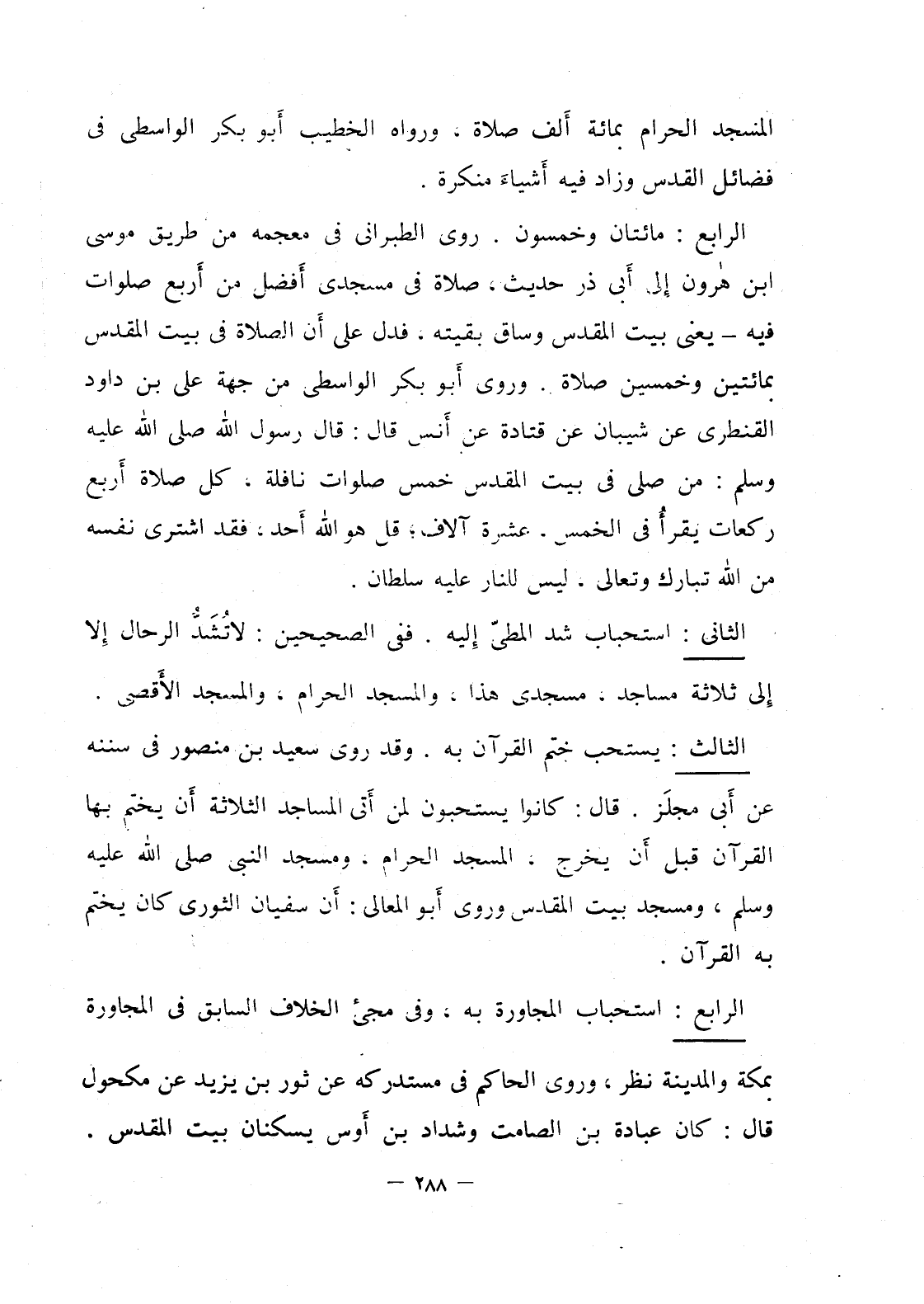 الرابع: مائتان وخمسون. روى الطبراني في معجمه من طريق موسى ابن هارون الى أبي ذر حديث. صلاة في مسجدى أفضل من أربع صلوات فيه يعني بيت المقدس وساق بقيته. فدل على أن الصلاة في بيت المقدس بمائتين وخمسين صلاة. وروى أبو بكر الواسطى من جهة على بن داود القنطرى عن شيبان عن قتادة عن أنس قال: قال رسول الله صل الله عليه وسلم: من صلى في بيت المقدس خمس صلوات نافله، كل صلاة أربع ركعات يقرأ في الخمس. عشر الاف - قل هو الله أحد، فقد اشترى نفسه من الله تبارك وتعالى. ليس للنار عليه سلطان.
