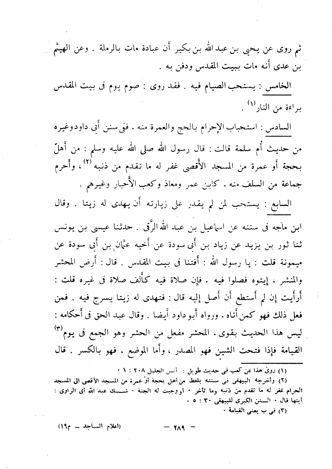 السابع: يستحب لمن لم يقدر على زيارته أن يهدي له زيتا، وقال ابن ماجه في سننه عن اسماعيل بن عبد الله الرقي حدثنا عيسى بن يونس ثنا ثور بن يزيد عن زياد بن ابي سودة عن اخيه عثمان بن ابي سودة عن ميمونه قلت: يارسول الله: افتنا في بيت المقدس قال: أرض المحشر والمنشر، ايتوه فصلوا فيه، فإن الصلاة فيه كألف صلاة في غيره قلت أرأيت ان لم أستطع أن أصل فيه قال: فتهدي له زيتا يسرج فيه فمن فعل ذلك كمن اتاه، ورواه ابو داوود ايضا ووقال عبد الله في احكامه: ليس هذا الحديث بقوى والمحشر مفعل من الحشر وهو الجمع في يوم القيامة، فإذا فتحت الشين فهو المصدر، وأما الموضع فهو بالكسر. قال