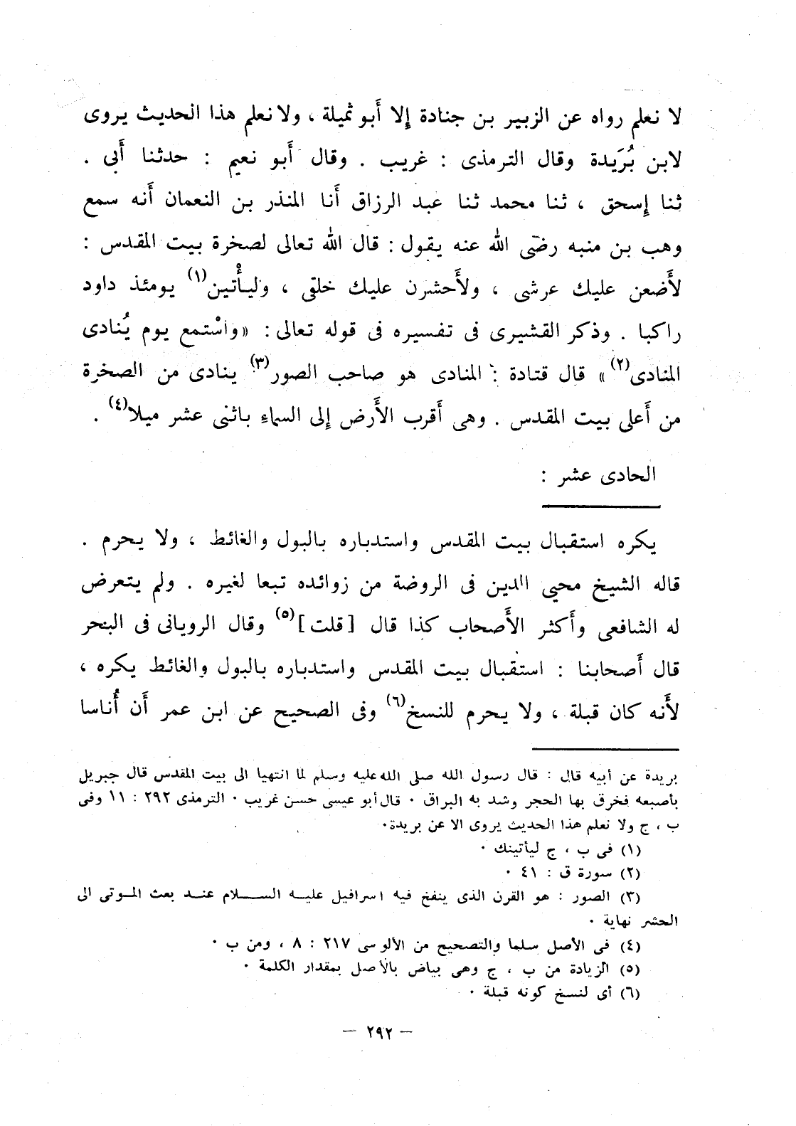 لا نعلم رواه عن الزبير بن جنادة الا ابو ثميلة، ولانعلم هذا الحديث يروى لابن بريدة وقال الترمذى: غريب. وقال ابو نعيم: حدثنا ابي. ثنا إسحق، ثنا محمد ثنا عبدالرزاق انا المنذر بن النعمان انه سمع وهب بن منبه رضي الله عنه يقول: قال الله تعالى لصخرة بيت المقدس: لأضعن عليك عرشي، ولأحشرن عليك خلقي، وليأتين يومئذ داود راكبا وذكر القشيري في تفسيرة في قوله تعالى: (وأستمع يوم ينادي المنادي) قال قتادة: المنادى هو صاحب الصور ينادي من الصخرة من اعلى البيت المقدس. وهي أقرب إلى السماء باثنى عشر ميلا