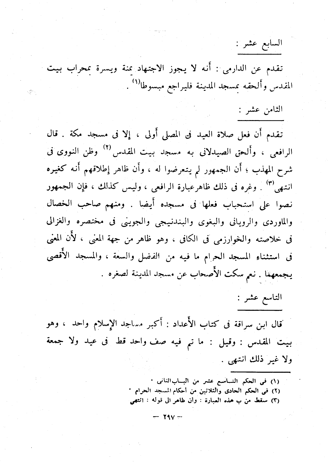 تقدم أن فعل صلاة العيد في المصلى أولى، إلا في مسجد مكة. قال الرافعي، وألحق الصيدلاني به مسجد بيت المقدس وظن النووي في شرح المهذب، أن الجمهور لم يتعرضوا له، وأن ظاهر إطلاقهم أنه كغيره انتهى. وغره في ذلك ظاهر عبارة الرافعي، وليس كذلك، فإن الجمهور نصوا على استحباب فعلها في مسجده أيضا. ومنهم صاحب الخصال والمارودي والروياني والبغوي والبندنيجي والجويني في مختصره والغزالي في خلاصته والخوارزمي في الكافي، وهو ظاهر من جهة المعنى، لأن المعنى في استثناء المسجد الحرام مافيه من الفضل والسعة، والمسجد الأقصى يجمعهما. نعم سكت الأصحاب عن مسجد المدينة لصغره.