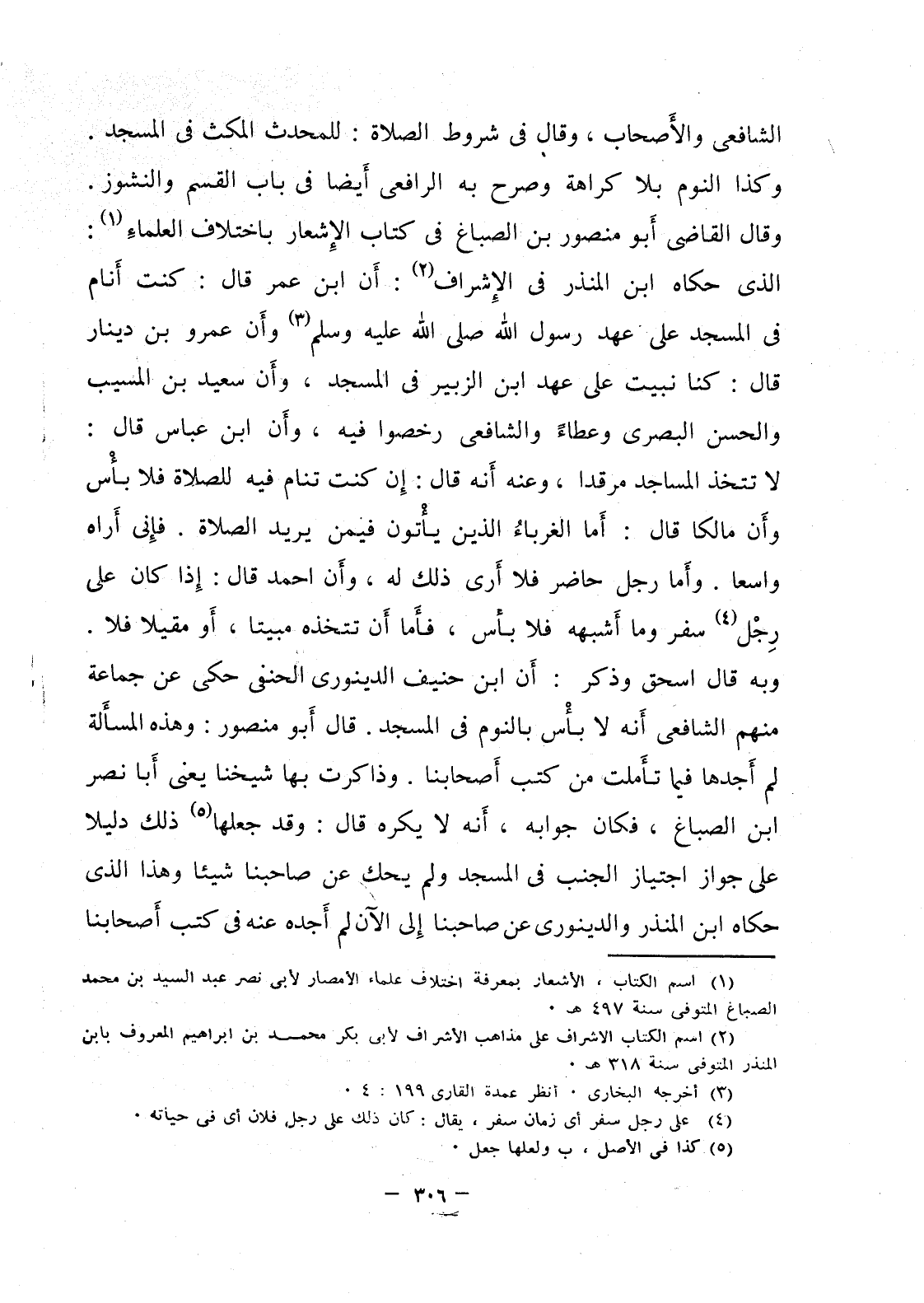 وبه قال اسحق وذكر: أن ابن حنيف الدينوري الحنفي حكى عن جماعة منهم الشافعي أنه لا بأس بالنوم في المسجد. قال أبو منصور: وهذه المسألة لم أجدها فيما تأملت من كتب أصحابنا. وذاكرت بها شيخنا أبا نصر ابن الصباغ، فكان جوابه، أنه لا يكره قال: وقد جعلها ذلك دليلا على جواز اجتياز الجنب في المسجد ولم يحك عن صاحبنا شيئا وهذا الذي حكاه ابن المنذر والدينوري عن صاحبنا إلى الآن لم أجده في في كتب أصحابنا