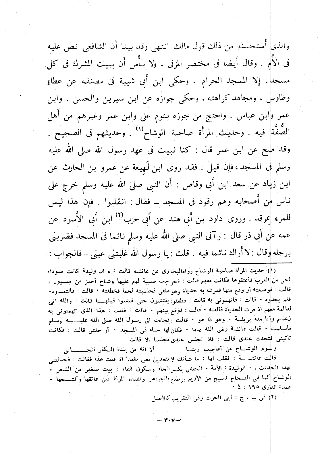والذي أستحسنه من ذلك قول مالك انتهى وقد بينا أن الشافعي نص عليه في الأم. وقال أيضا في مختصر المزني ولا بأس أن يبيت لمشرك في كل مسجد، إلا المسجد الحرام، وحكى ابن أبي شيبة في مصنفه عن عطاءٍ وطاوس، ومجاهد كراهته، وحكى جوازه عند ابن سيرين والحسن. وابن عمرو وابن عباس. واحتج من جوزه بنوم علي وابن عمر وغيرهم من أهل الصفَّة فيه. وحديث المرأة صاحبة الوشاح. وحديثهم في الصحيح. وقد صح عن ابن عمر قال: كنا نبيت في عهد رسول الله صلى الله عليه وسلم في المسجد، فإن قيل: فقد روى ابن لَهِيعة عن عمرو بن الحارث عن ابن زياد عن سعد بن أبي وقاص: أن النبي صلى الله عليه وسلم خرج على ناس من أصحابه وهم رقود في المسجد - فقال: انقلبوا. فإن هذا ليس للمرء بمرقد. وروى داود بن أبي هند عن أبي حرب ابن أبي الأسود عن عمه عن أبي ذر قال: رآني الني صلى الله عليه وسلم في المسجد نائما فضربني برجله وقال: لا أراك نائمًا فيه. قلت: يا رسول الله غلبتني عيني - فالجواب