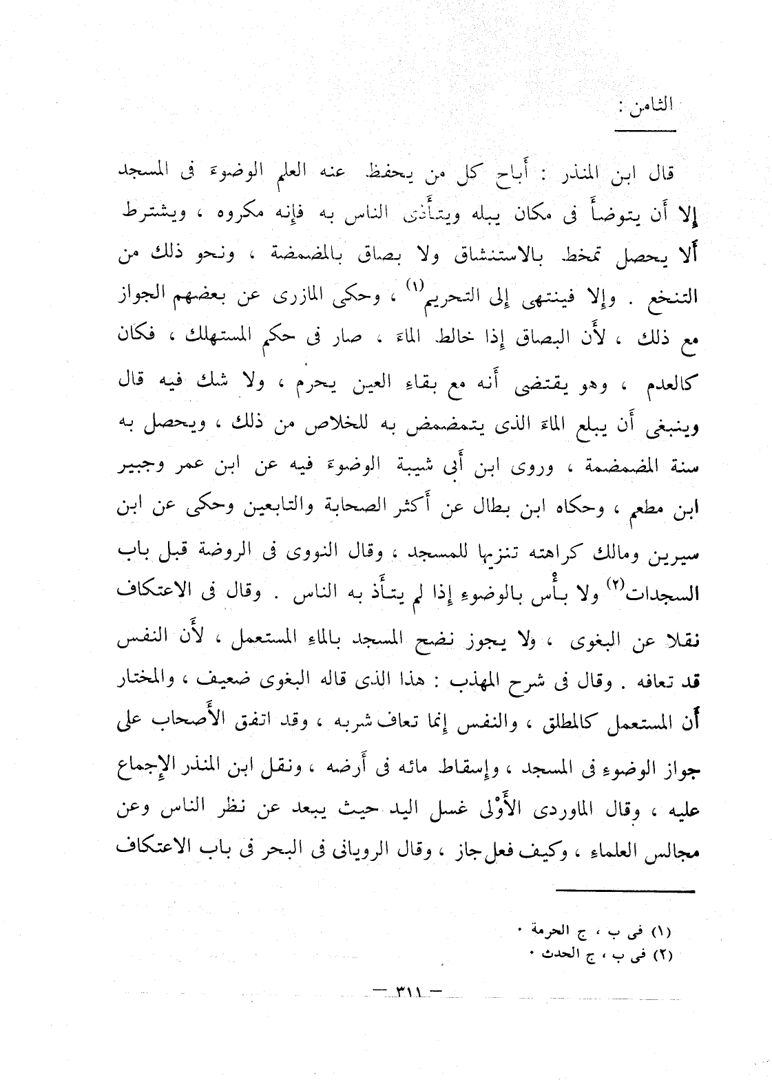 وقال في الاعتكاف نقلا عن البغوى: ولا يجوز نضح المسجد بالماء المستعمل، لأن النفس قد تعافه. وقال في شرح المهذب: هذا الذي قاله البغوى ضعيف، والمختار أن المستعمل كالمطلق، والنفس إنما تعاف شربه، وقد اتفق الأصحاب على جواز الوضوء في المسجد، وإسقاط مائه في أرضه، ونقل ابن المنذر الإجماع عليه،