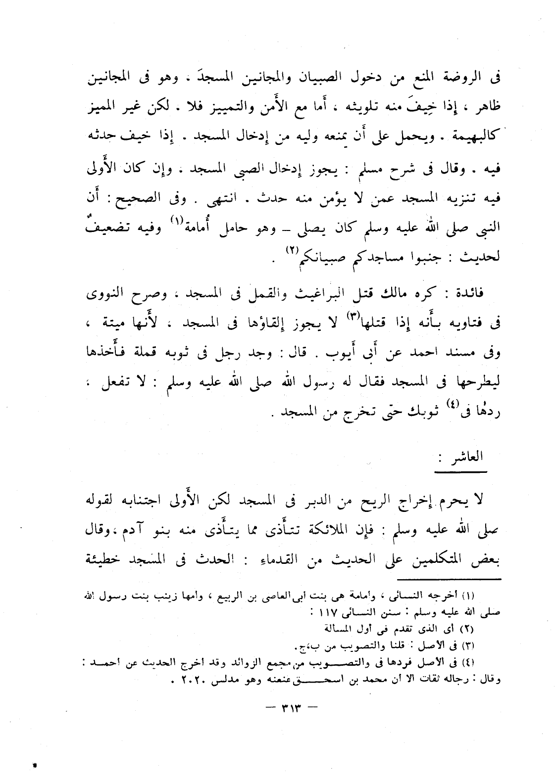 في الروضة المنع من دخول الصبيان والمجانين المسجد وهو في المجانين ظاهر إذا خيف منه تلويثه، أما مع الأمن والتمييز فلا لكن غير المميز كالبهيمة ويحمل على أن يمنعه وليه من إدخال المسجد إذا خيف حدثه فيه وقال في شرح مسلم يجوز إدخال الصبي المسجد وإن كان الأولى فيه تنزيه المسجد عمن لا يؤمن منه حدث. انتهى وفي الصحيح أن النبي صلى الله عليه وسلم كان يصلي وهو حامل أمامة وفيه تضعيف لحديث جنبوا مساجدكم صبيانكم