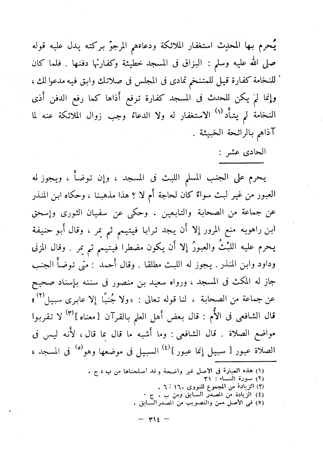 يحرم على الجنب المسلم اللبث في المسجد، وإن توضأ، ويجوز له العبور من غير لبث سواء كان لحاجة أم لا.؟ هذا مذهبنا، وحكاه ابن المنذر عن جماعة من الصحابة والتابعين، وحكى عن سفيان الثوري وإسحق ابن راهويه منع المرور إلا أن يجد ترابا فيتيمم ثم يمر، وقال أبو حنيفة يحرم عليه اللبث والعبور إلا أن يكون مضطرا فيتيمم ثم يمر وقال المزني وداود وابن المنذر. يجوز له اللبث مطلقا. وقال أحمد: متى توضأ الجنب جاز له المكث في المسجد، ورواه سعيد ابن منصور في سننه إسناد صحيح عن جماعة من الصحابة، لنا قوله تعالى: ((ولا جنبا إلا عابري سبيل))