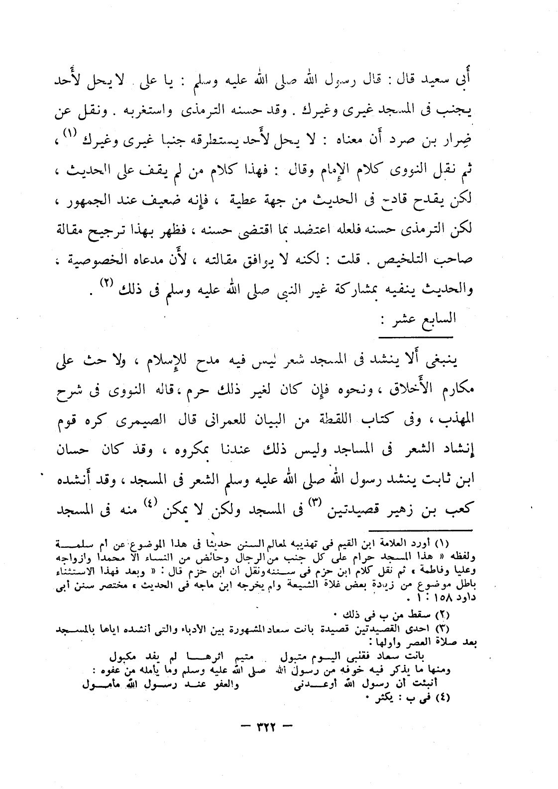 أبي سعيد قال: قال رسول الله صلى الله عليه وسلم: يا علي لا يحل لأحد يجنب في المسجد غيري وغيرك. وقد حسنه الترمذي واستغربه. ونقل عن ضرار بن صرد أن معناه: لا يحل لأحد يستطرقه جنبا غيري وغيرك، ثم نقل النووي كلام الإمام وقال: فهذا كلام من لم يقف على الحديث، لكم يقدح قادح في الحديث من جهة عطية، فإنه ضعيف عند الجمهور، لكن الترمذي حسنه فلعله اعتضد بما اقتضى حسنه، فظهر بهذا ترجيح مقالة صاحب التلخيص. قلت: لكنه لا يوافق مقالته، لأن مدعاه الخصوصية، والحديث ينفيه بمشاركة غير النبي صلى الله عليه وسلم في ذلك.