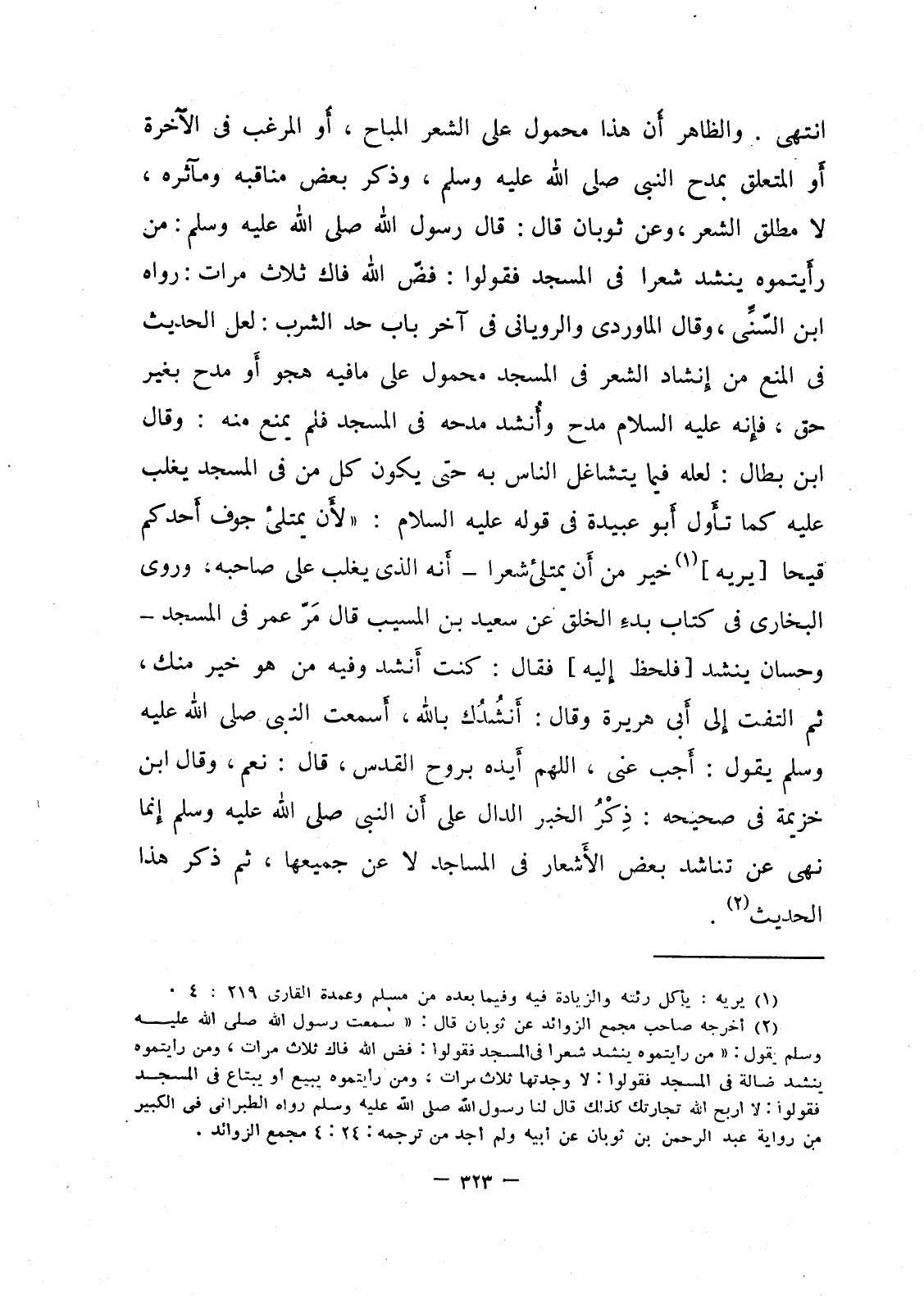 انتهى. والظاهر أن هذا محمول على الشعر المباح، أو المرغب في الآخرة أو المتعلق بمدح النبي صلى الله عليه وسلم، وذكر بعض مناقبه ومآثره، لا مطلق الشعر، وعن ثوبان قال: قال رسول الله صلى الله عليه وسلم: من رأيتموه ينشد شعرا في المسجد فقولوا: فضّ الله فاك ثلاث مرات: رواه ابن السّنِّى، وقال الماوردي والروياني في آخر باب حد الشرب: لعل الحديث في المنع من إنشاد الشعر في المسجد محمول على ما فيه هجو أَو مدح بغير حق، فإنه عليه السلام مدح وأُنشد مدحه في المسجد فلم يمنع منه: وقال ابن بطال: لعله فيما يتشاغل الناس به حتى يكون كل من في المسجد يغلب عليه كما تأّول أبو عبيدة في قوله عليه السلام: " لأَن يمتلئ جوف أحدكم قيحاً [يريه] خير من أن يمتلئ شعرا - أَنه الذي يغلب على صاحبه، وروى البخاري في كتاب بدءِ الخلق عن سعيد بن المسيب قال مَرّ عمر في المسجد _ وحسان ينشد [فلحظ إليه] فقال: كنت أنشد وفيه من هو خير منك، ثم التفت إلى أبي هريرة وقال: أَنشُدُك بالله، أسمعت النبي صلى الله عليه وسلم يقول: أَجب عنى، اللهم أَيده بروح القدس، قال نعم، وقال ابن خزيمة في صحيحه: ذِكْرُ الخبر الدال على أن النبي صلى الله عليه وسلم إنما نهى عن تناشد بعض الأَشعار في المساجد لا عن جميعها، ثم ذكر هذا الحديث.