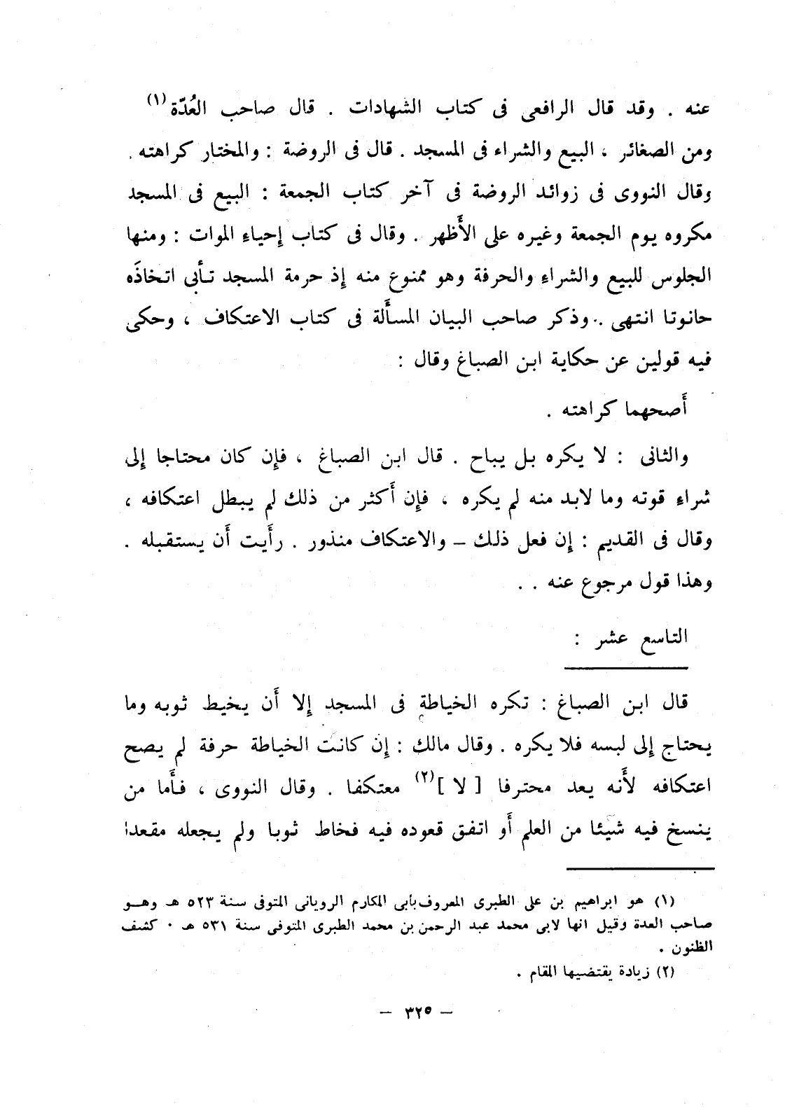 وقال النووي في زوائد الروضة في آخر كتاب الجمعة: البيع في المسجد مكروه يوم الجمعة وغيره على الأظهر. وقال في كتاب إحياءِ الموات: ومنها الجلوس للبيع والشراء والحرفة وهو ممنوع منه إذ حرمة المسجد تأبى اتخاذَه حانوتاً انتهى. وذكر صاحب البيان المسألة في كتاب الاعتكاف، وحكى فيه قولين عن حكاية ابن الصباغ وقال: