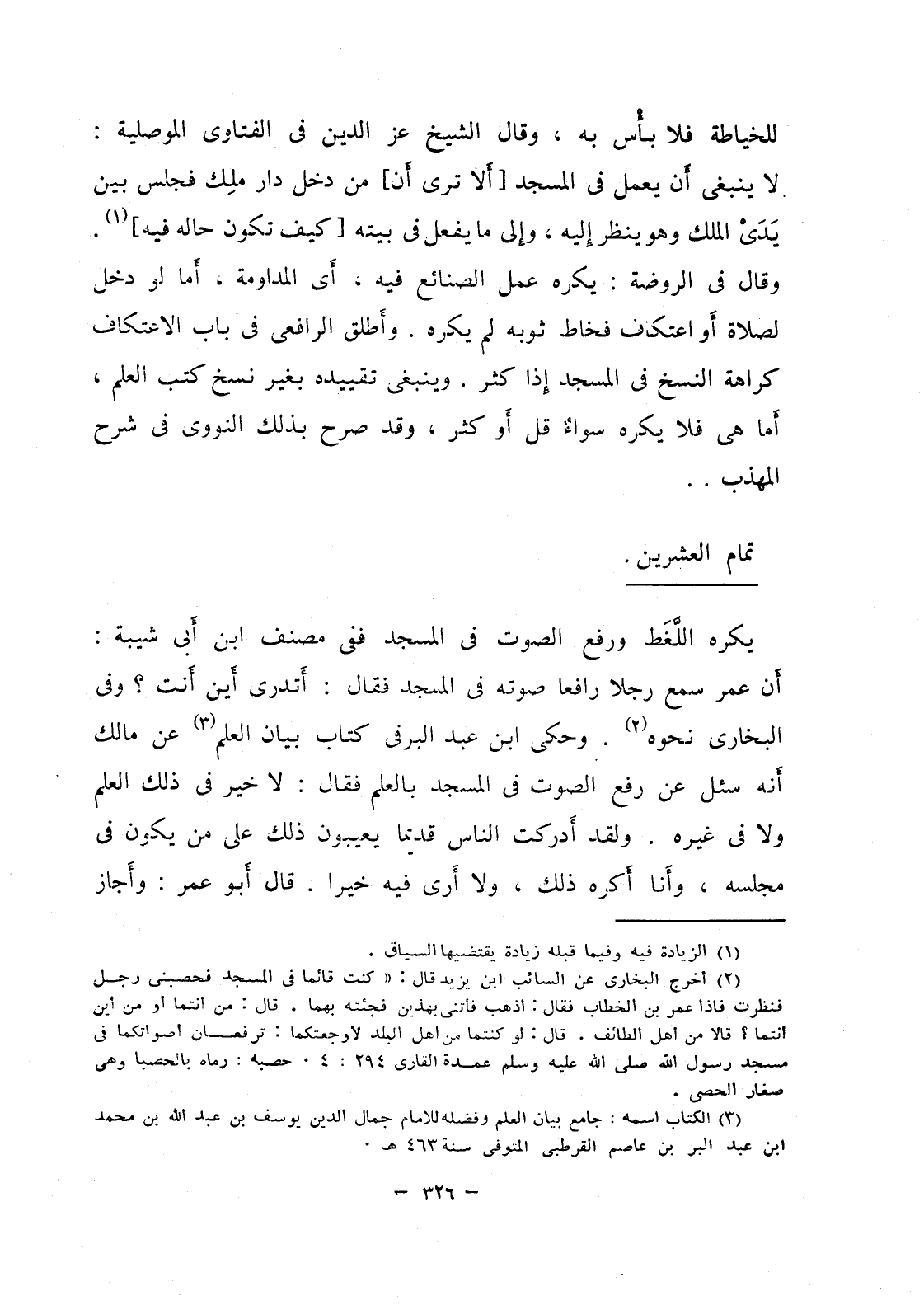 للخياطة فلا بأس به، وقال الشيخ عز الدين في الفتاوي الموصلية: لا ينبغي أن يعمل في المسجد [ألا ترى أن] من دخل دار ملك فجلس بين يدي الملك وهو ينظر إليه، وإلى ما يفعل في بيته [كيف تكون حاله فيه]، وقال في الروضة: يكره عمل الصنائع فيه، أي المداومة، أما لو دخل لصلاة أو اعتكاف فخاط ثوبه لم يكره، وأطلق الرافعي في باب الاعتكاف كراهة النسخ في المسجد إذا كثر، وينبغي تقييده بغير نسخ كتب العلم، أما هي فلا يكره سواء قل أو كثر، وقد صرح بذلك النووي في شرح المهذب.