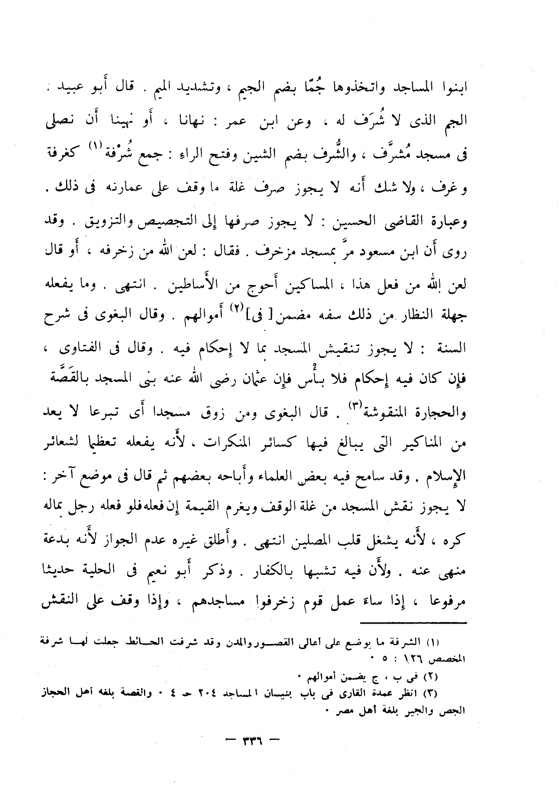 ابنوا المساجد واتخذوها جما بضم الجيم، وتشديد الميم، قال أبو عبيد: الجم الذي لا شرف له، وعن ابن عمر: نهانا، أو نهينا أن نصلي في مسجد مشرف، والشرف بضم الشين وفتح الراء: جمع شرفة كغرفة وغرف، ولا شك أنه لا يجوز صرف غلة، ما وقف على عمارته في ذلك، وعبارة القاضي الحسين: لا يجوز صرفها إلى التجصيص والتزويق، وقد روى أن ابن مسعود مر بمسجد مزخرف، فقال: لعن الله من زخرفه، أو قال لعن الله من فعل هذا، المساكين أحوج من الأساطين، انتهى، وما يفعله جهلة النظار من ذلك سفه مضمن [في] أموالهم، وقال البغوي في شرح السنة: لا يجوز تنقيش المسجد بما لا إحكام فيه، وقال في الفتاوي، فإن كان فيه إحكام فلا بأس فإن عثمان رضي الله عنه بني المسجد بالقصة والحجارة المنقوشة، قال البغوي ومن زوق مسجدا أي تبرعا لا يعد من المناكير التي يبالغ فيها كسائر المنكرات، لأنه يفعله تعظيما لشعائر الإسلام، وقد سامح فيه بعض العلماء واباحه بعضهم ثم قال في موضع آخر: لا يجوز نقش المسجد من غلة الوقف ويغرم القيمة إن فعله فلو فعله رجل بماله كره، لأنه يشغل قلب المصلين انتهى، وأطلق غيره عدم الجواز لأنه بدعة منهي عنه، ولأن فيه تشبها بالكفار، وذكر أبو نعيم في الحلية حديثا مرفوعا إذا ساء عمل قوم زخرفوا مساجدهم، وإذا وقف على النقش