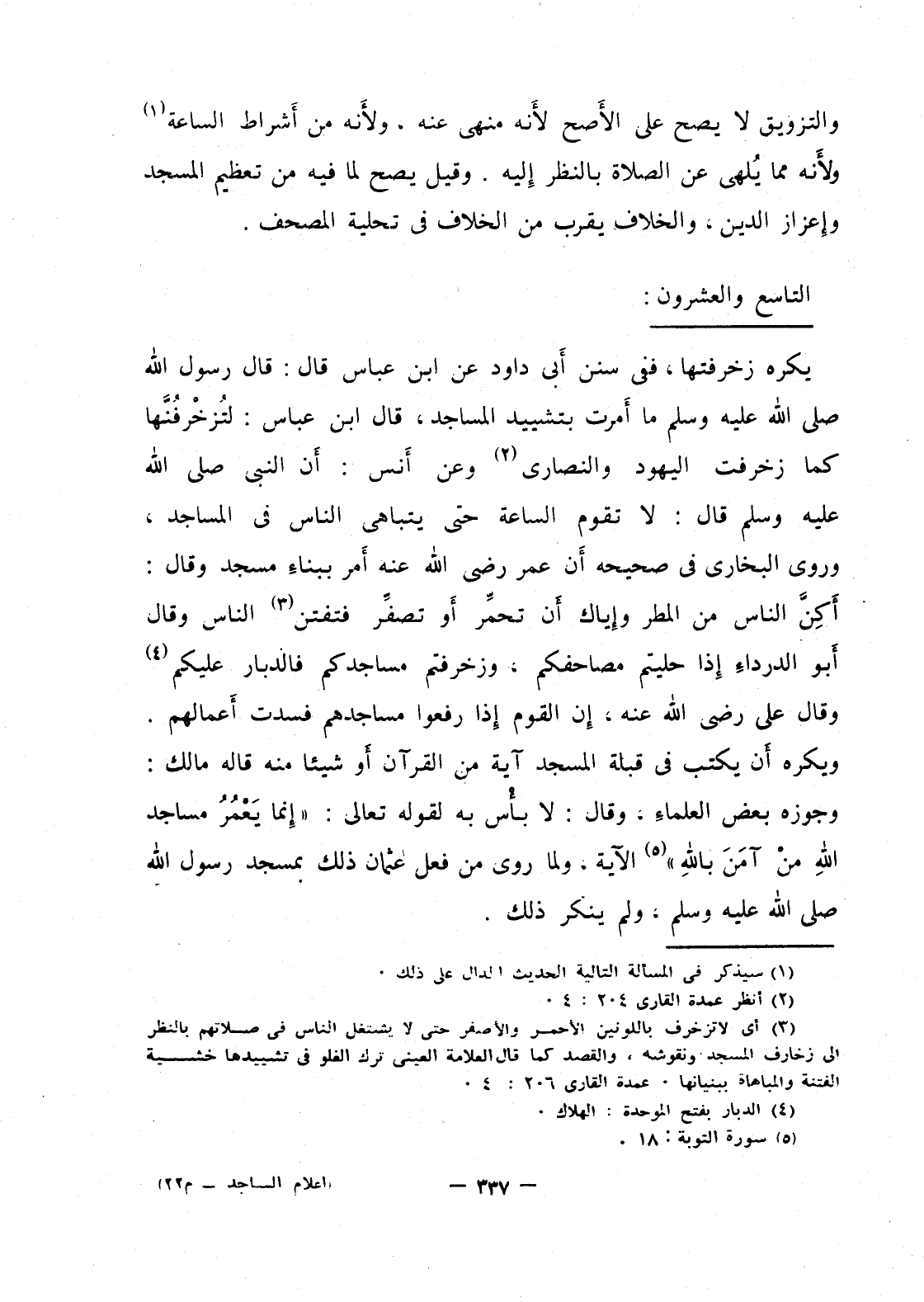 يكره زخرفتها، ففي سنن أبي داود عن ابن عباس قال: قال رسول الله صلى الله عليه وسلم ما أمرت بتشييد المساجد، قال ابن عباس: لتزخرفنها كما زخرفت اليهود والنصاري وعن انس: أن النبي صلى الله عليه وسلم قالأ: لا تقوم الساعة حتى يتباهى الناس في المساجد، وروى البخاري في صحيحه أن عمر رضي الله عنه أمر ببناء مسجد وقال: أكن الناس من المطر وإياك أن تحمر أو تصفر فتفتن الناس وقال أبو الدرداء إذا حليتم مصاحفكم، وزخرفتم مساجدكم فالدبار عليكم، وقال علي رضي الله عنه، إن القوم إذا رفعوا مساجدهم فسدت أعمالهم، ويكره أن يكتب في قبلة المسجد آية من القرآن أو شيئا منه قاله مالك، وجوزه بعض العلماء، وقال: لا بأس به لقوله تعالى: إنما يعمر مساجد الله من آمن بالله، الاية، ولما روى من فعل عثمان ذلك بمسجد رسول الله صلى الله عليه وسلم، ولم ينكر ذلك.