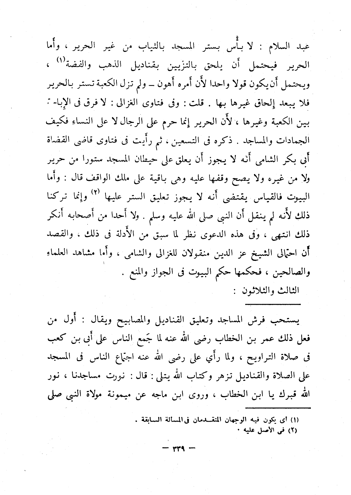 عبد السلام: لا بأس بستر المسجد بالثياب من غير الحرير، وأما الحرير فيحتمل أن يلحق بالتزيين بقناديل الذهب والفضة، ويحتمل أن يكون قولا واحدا لأن أمره أهون – ولم تزل الكعبة تستر بالحرير فلا يبعد إلحاق غيرها بها، قلت: وفي فتاوي الغزالي: لا فرق في الإباحة بين الكعبة وغيرها، لأن الحرير إنما حرم على الرجال لا على النساء فكيف الجمادات والمساجد، ذكره في التسعين ثم رأيت في فتاوي قاضي القضاة أبي بكر الشامي أنه لا يجوز أن يعلق على حيطان المسجد ستورا من حرير ولا من غيره ولا يصح وقفها عليه وهي باقية على ملك الواقف قال: وأما البيوت فالقياس يقتضي أنه لا يجوز تعليق الستر عليها، وإنما تركنا ذلك لأنه لم ينقل أن النبي صلى الله عليه وسلم/ ولا أحدا من أصحابه أنكر ذلك انتهى، وفي هذه الدعوى نظر لما سبق من الأدلة في ذلك، والقصد أن احتمالي الشيخ عز الدين منقولان للغزالي والشامي، وأما مشاهد العلماء والصالحين، فحكمها حكم البيوت في الجواز والمنع.