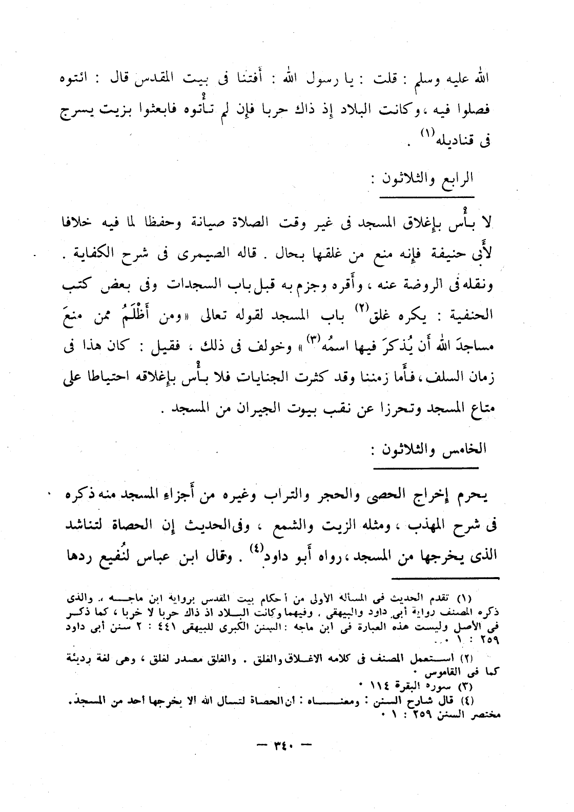 الله عليه وسلم: قلت: يارسول الله: أفتنا في بيت المقدس قال: ائتوه فصلوا فيه، وكانت البلاد إذ ذاك حربا فإن لم تأتوه فابعثوا بزيت يسرج في قناديله.