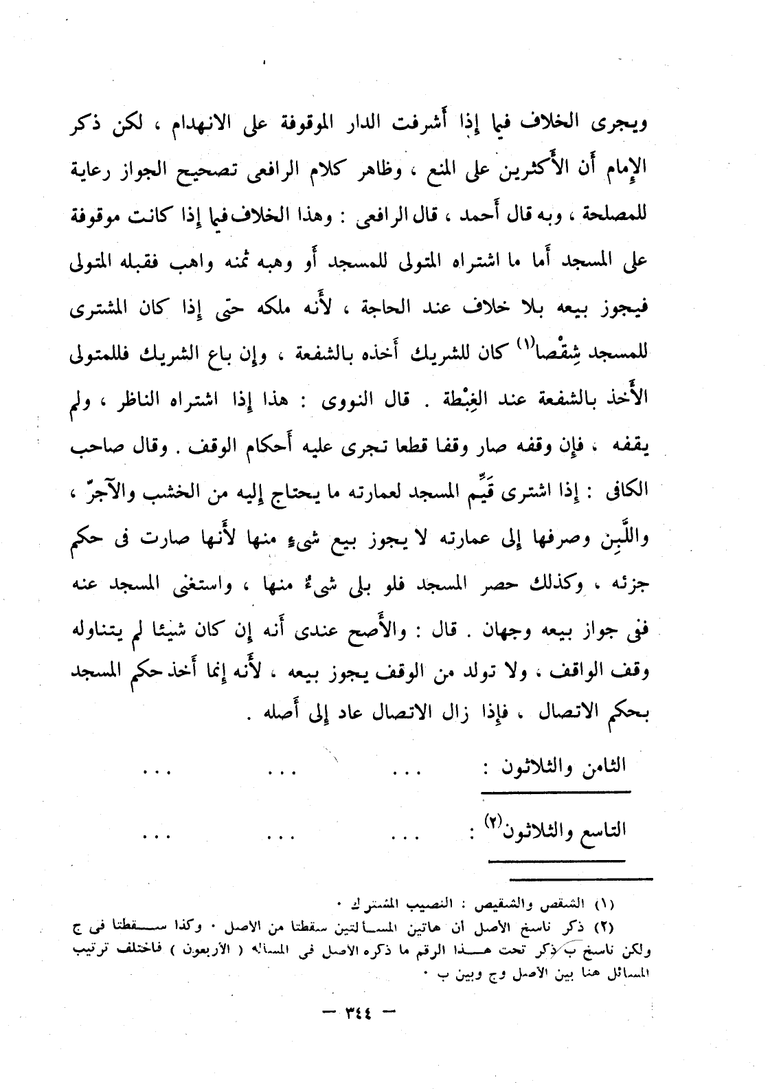 ويجري الخلاف فيما إذا أشرفت الدار الموقوفة على الانهدام، لكن ذكر الإمام أن الأكثرين على المنع، وظاهر كلام الرافعي تصحيح الجواز رعاية للمصلحة، وبه قال أحمد، قال الرافعي: وهذا الخلاف فيما إذا كانت موقوفة على المسجد اما ما اشتراه المتولي للمسجد أو هبة ثمنه واهب فقبله المتولي فيجوز بيعه بلا خلاف عند الحاجة، لأنه ملكه حتى إذا كان المشتري للمسجد شقصا كان للشريك أخذه بالشفعة، وإن باع الشريك فللمتولي الأخذ بالشفعة عند الغبطة، قال النووي: هذا إذا اشتراه الناظر، ولم يقفه، فإن وقفه صار وقفا قطعا تجري عليه أحكام الوقف، وقال صاحب الكافي: إذا اشترى قيم المسجد لعمارته ما يحتاج إليه من الخشب والآجر، واللبن وصرفها إلى عمارته لا يجوز بيع شيء منها لأنها صارت في حكم جزئه، وكذلك حصر المسجد فلو بلى شيء منها، واستغنى المسجد عنه ففي جواز بيعه وجهان، قال: والأصح عندي أنه إن كان شيئا لم يتناوله وقف الواقف، ولا تولد من الوقف يجوز بيعه لأنه إنما أخذ حكم المسجد بحكم الاتصال، فإذا زال الاتصال عاد إلى أصله.