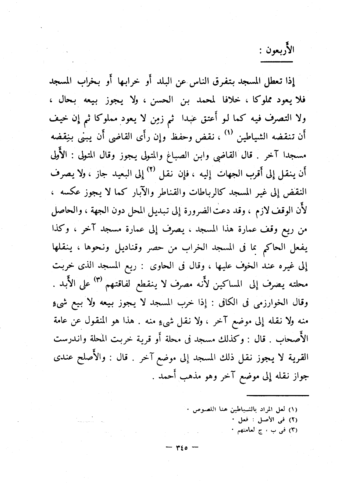 إذا تعطل المسجد بتفرق الناس عن البلد أو خرابها أو بخراب المسجد فلا يعود مملوكا، خلافا لمحمد بن الحسن، ولا يجوز بيعه بحال، ولا التصرف فيه كما لو أعتق عبدا ثم زمن لا يعود مملوكا ثم إن خفيف أن تنقضه الشياطين، نقض وحفظ وإن رأى القاضي أن يبني بنقضه مسجدًا آخر، قال القاضي وابن الصباغ والمتولي يجوز وقال المتولي: الأولى أن ينقل إلى أقرب الجهات إليه، فإن نقل إلى البعيد جاز، ولا يصرف النقض إلى غير المسجد كالرباطات والقناطر والآبار كما لا يجوز عكسه، لأن الوقف لازم، وقد دعت الضرورة إلى تبديل المحل دون الجهة، والحاصل من ريع وقف عمارة هذا المسجد، يصرف إلى عمارة مسجد آخر، وكذا يفعل الحاكم بما في المسجد الخراب من حصر وقناديل ونحوها، ينقلها إلى غيره عند الخوف عليها، وقال في الحاوي، ريع المسجد الذي خربت محلته يصرف إلى المساكن لأنه مصرف لا ينقطع لفاقتهم على الأبد. وقال الخوارزمي في الكافي: إذا خرب المسجد لا يجوز بيعه ولا بيع شيء منه ولا نقله إلى موضع آخر، ولا نقل شيء منه، هذا هو المنقول عن عامة الأصحاب، قال: وكذلك مسجد في محلة أو قرية خربت المحلة واندرست القرية لا يجوز نقل ذلك المسجد إلى موضع آخر، قال: والأصلح عندي جواز نقله إلى موضع آخر وهو مذهب أحمد.
