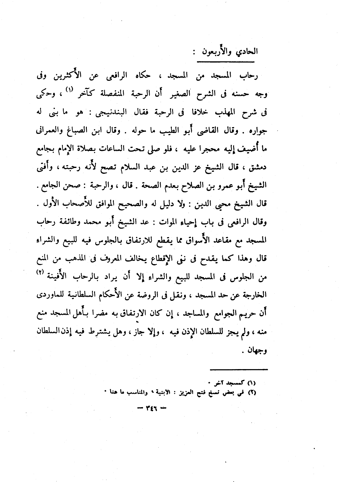 رحاب المسجد من المسجد، حكاه الرافعي عن الأكثرين وفي وجه حسنه في الشرح الصغير ان الرحبة المنفصلة كآخر، وحكي في شرح المهذب خلافا في الرحبة فقال البندنيجي، وهو ما بني له جواره، وقال القاضي أبو الطيب ما حوله، وقال ابن الصباغ والعمراني ما أضيف إليه محجرا عليه، فلو صلى تحت الساعات بصلاة الإمام بجامع دمشق، قال الشيخ عز الدين بن عبد السلام تصح لأنه رحبته، وأفتي الشيخ ابو عمرو بن الصلاح بعدم الصحة، قال، والرحبة: صحن الجامع، قال الشيخ محي الدين: ولا دليل له والصحيح الموافق للأصحاب الأول، وقال الرافعي في باب إحياء الموات: عد الشيخ أبو محمد وطائفة رحاب المسجد مع مقاعد الأسواق مما يقطع للارتفاق بالجلوس فيه للبيع والشراء قال وهذا كما يقدح في نفي الإقطاع يخالف المعروف في المذهب من المنع من الجلوس في المسجد للبيع والشراء إلا أن يراد بالرحاب الأفينة، الخارجة عن حد المسجد، ونقل في الروضة عن الأحكام السلطانية للماوردي أن حريم الجوامع والمساجد، إن كان الارتفاق به مضرا بأهل المسجد منع منه، ولم يجز للسلطان الإذن فيه، وإلا جاز، وهل يشترط فيه إذن السلطان وجهان.