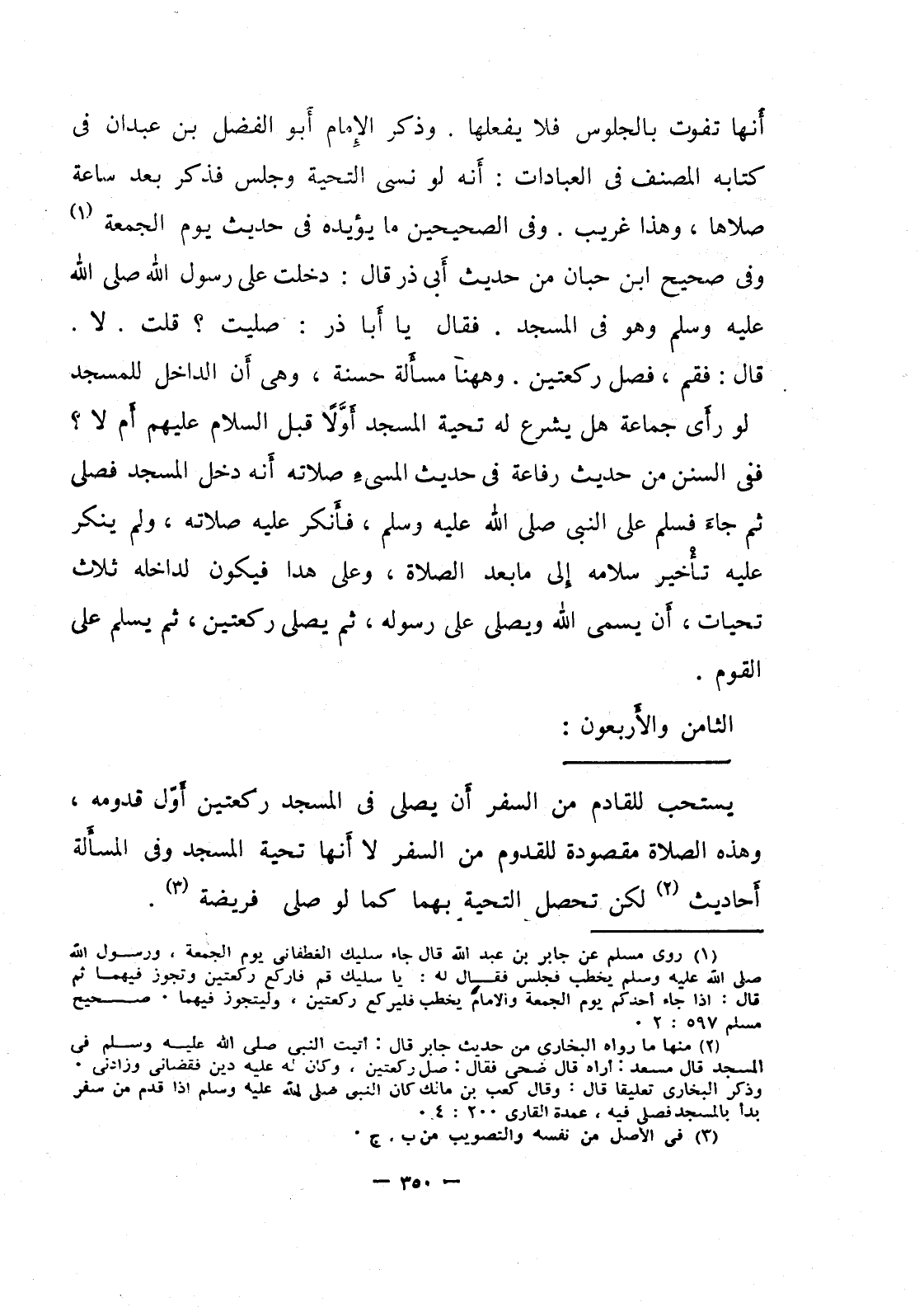 أنها تفوت بالجلوس فلا يفعلها، وذكر الإمام أبو الفضل بن عبدان في كتابه المصنف في العبادات: أنه لو نسي التحية وجلس فذكر بعد ساعة صلاها، وهذا غريب، وفي الصحيحين ما يؤيده في حديث يوم الجمعة وفي صحيح ابن حبان من حديث أبي ذر قال: دخلت على رسول الله صلى الله عليه وسلم وهو في المسجد، فقال يا أبا ذر: صليت؟ قلت: لا، قال فقم، فصل ركعتين، وههنا مسألة حسنة، وهي أن الداخل للمسجد لو رأي جماعة هل يشرع له تحية المسجد أولا قبل السلام عليهم أم لا؟ ففي السنن من حديث رفاعة في حديث المسيء صلاته أنه دخل المسجد فصلى ثم جاء فسلم على النبي صلى الله عليه وسلم فأنكر عليه صلاته، ولم ينكر عليه تأخير سلامه إلى ما بعد الصلاة، وعلى هذا فيكون لداخله ثلاث تحيات، أن يسمى الله ويصلي على رسوله، ثم يصلي ركعتين ثم يسلم على القوم.