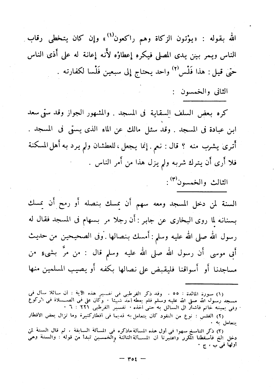 كره بعض السلف السقاية في المسجد، والمشهور الجواز وقد سقى سعد بن عبادة في المسجد، وقد سئل مالك عن الماء الذي يسقي في المسجد، وأترى يشرب منه؟ قال: نعم، إنما يجعل للعطشان ولم يرد به أهل المسكنة فلا أرى أن يترك شربه ولم يزل هذا من أمر الناس.