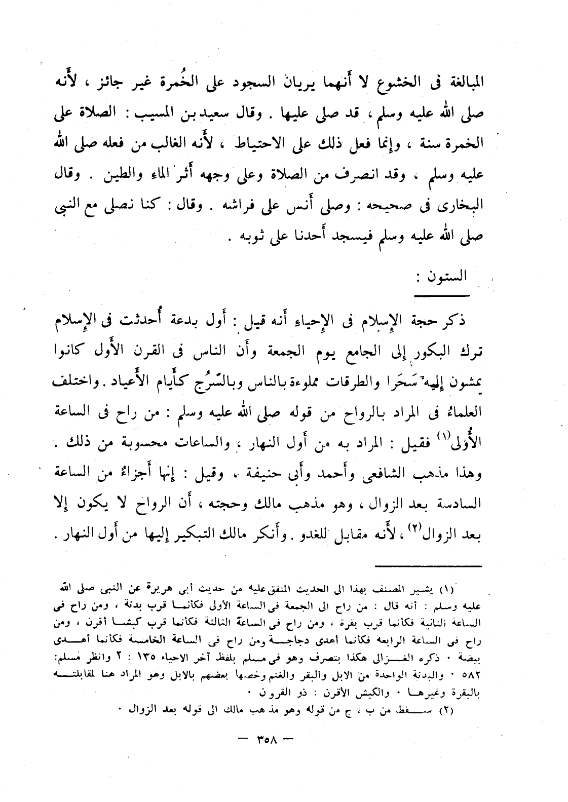 ذكر حجة الإسلام في الإحياء أنه قيل: أول بدعة أحدثت في الإسلام ترك البكور إلى الجامع يوم الجمعة وأن الناس في القرن الأول كانوا يمشون إليه سحرا والطرقات مملوءة بالناس وبالسرج كأيام الأعياد، واختلف العلماء في المراد بالرواح، من قوله صلى الله عليه وسلم: من راخ في الساعة الأولى فقيل: المراد به من أول النهار، والساعات محسوبة من ذلك، وهذا مذهب الشافعي وأحمد وأبي حنيفة، وقيل: إنها أجزاء، من الساعة السادسة بعد الزوال، وهو مذهب مالك وحجته، أن الرواح لا يكون إلا بعد الزوال، لأنه مقابل للغدو، وأنكر مالك التبكير إليها من أول النهار.