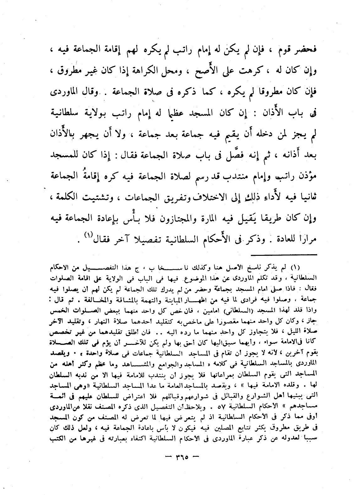 فحضر قوم، فإن لم يكن له إمام راتب لم يكره لهم إقامة الجماعة فيه، وإن كان فيه، كرهت على الأصح، ومحل الكراهة إذا كان غير مطروق، فإن كان مطروقا لم يكره، كما ذكره في صلاة الجماعة، وقال الماوردي في باب الأذان: إن كان المسجد عظيما له إمام راتب بولاية سلطانية لم يجز لمن دخله أن يقيم فيه جماعة بعد جماعة، ولا أن يجهر بالأذان بعد أذانه، ثم إنه فصل في باب صلاة الجماعة فقال: إذا كان للمسجد مؤذن راتب وإمام منتدب قد رسم لصلاة الجماعة فيه كره إقامة الجماعة ثانيا فيه لأداء ذلك إلى الاختلاف وتفريق الجماعات، وتشتيت الكلمة وإن كان طريقا يقيل فيه المارة والمجتازون فلا بأس بإعادة الجماعة فيه مرارا للعادة، وذكر في الأحكام السلطانية تفصيلا آخر فقال: