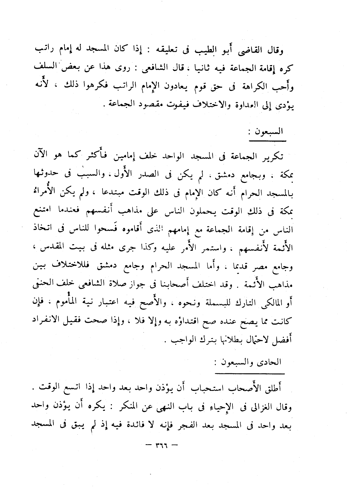 تكرير الجماعة في المسجد الواحد خلف إمامين فأكثر كما هو الآن بمكة، ويجامع دمشق، لم يكن في الصدر الأول، والسبب في حدوثها بالمسجد الحرام أنه كان الإمام في ذلك الوقت مبتدعا، ولم يكن الأمراء بمكة في ذلك الوقت يحملون الناس على مذاهب أنفسهم فعندنا امتنع الناس من إقامة الجماعة مع إمامهم الذي أقاموه فسحوا للناس في اتخاذ الأئمة لأنفسهم، واستمر الأمر عليه وكذا جرى مثله في بيت المقدس، وجامع مصر قديما، وأما المسجد الحرام وجامع دمشق فللاختلاف بين مذاهب الأئمة، وقد اختلف أصحابنا في جواز صلاة الشافعي خلف الجنفي أو المالكي الترك للبسملة ونحوه، والأصح فيه اعتبار نية المأموم، فإن كانت مما يصح عنده صح اقتداؤه، به وإلا فلا، وإذا صحت فقيل الانفراد أفضل لاحتمال بطلانها بترك الواجب.