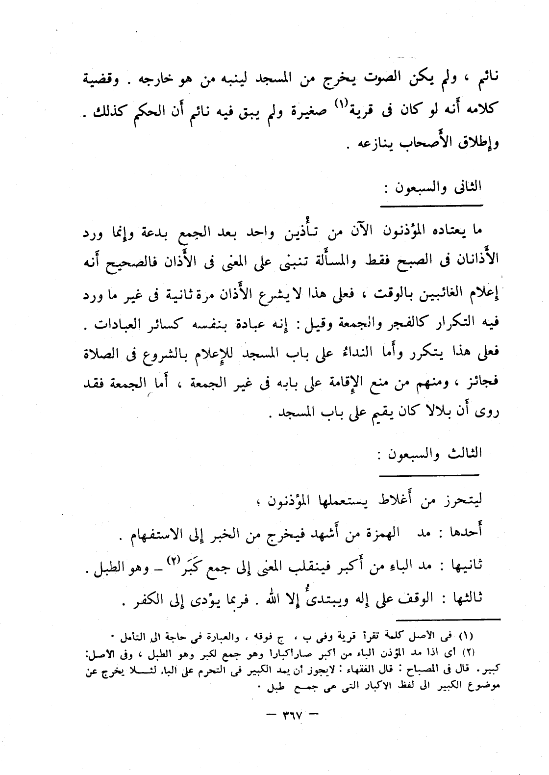 ما يعتاده المؤذنون الآن من تأذين واحد بعد الجمع بدعة وإنما ورد الأذانان في الصبح فقط والمسألة تنبني على المعنى في الأذن فالصحيح أنه إعلام الغائبين بالوقت، فعلى هذا لا يشرع الأذان مرة ثانية في غير ما ورد فيه التكرار كالفجر والجمعة وقيل: إنه عبادة بنفسه كسائر العبادات. فعلى هذا يتكرر وأما النداء على باب المسجد للإعلام بالشروع في الصلاة فجائز، ومنهم من منع الإقامة على بابه في غير الجمعة، أما الجمعة فقد روى أن بلالا كان يقيم على باب المسجد.