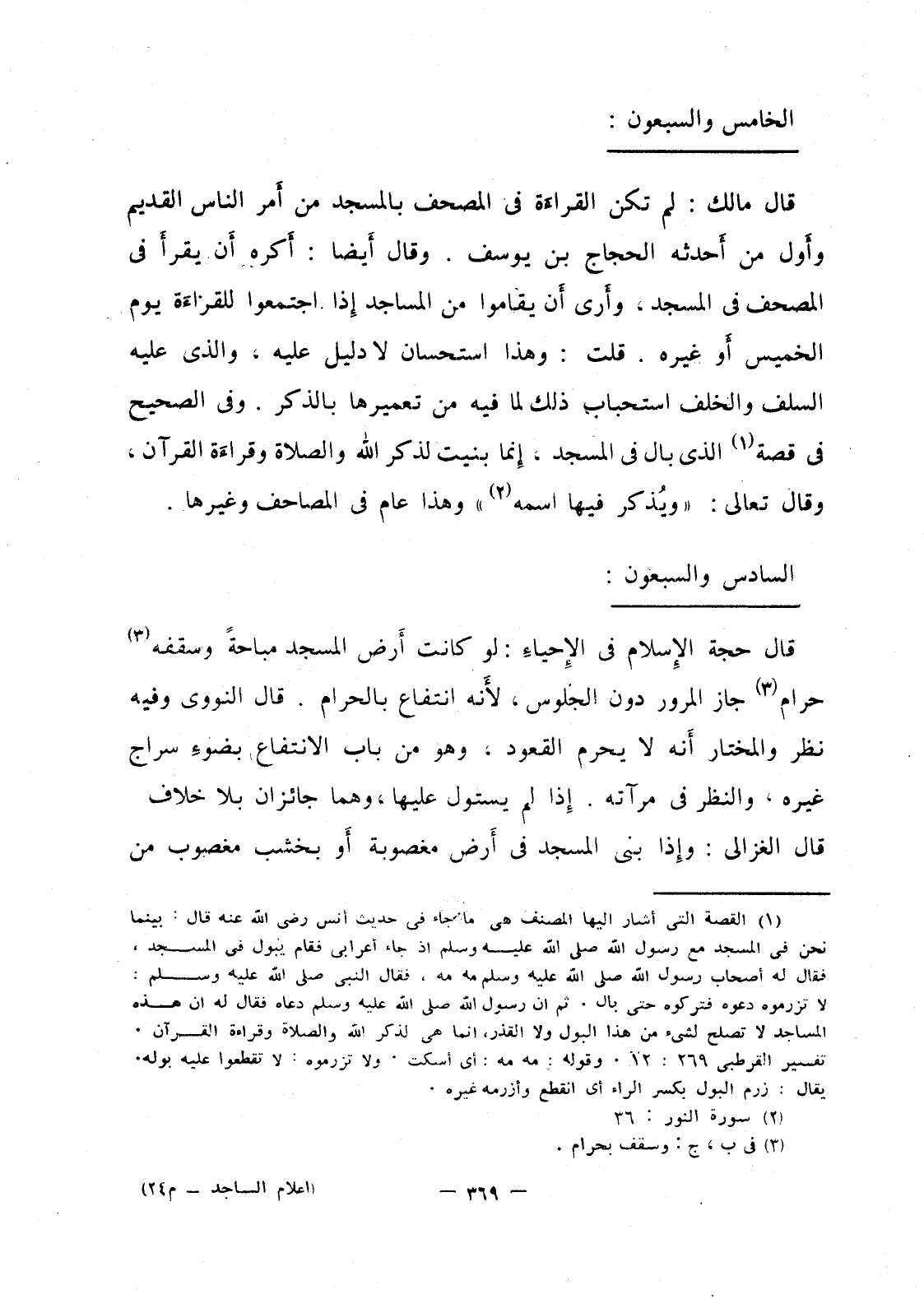 قال مالك: لم تكن القراءة في المصحف بالمسجد من أمر الناس القديم وأول من أحدثه الحجاج بن يوسف، وقال أيضا: أكره أن يقرأ في المصحف في المسجد، وأرى أن يقاموا من المساجد إذا اجتمعوا للقراءة يوم الخميس أو غيره، قلت: وهذا استحسان لا دليل عليه، والذي عليه السلف والخلف استحباب ذلك لما فيه من تعميرها بالذكر، وفي الصحيح في قصة الذي بال في المسجد، إنما بنيت لذكر الله والصلاة وقراءة القرآن، وقال تعالى: {ويذكر فيها اسمه} وهذا عام في المصاحب وغيرها.