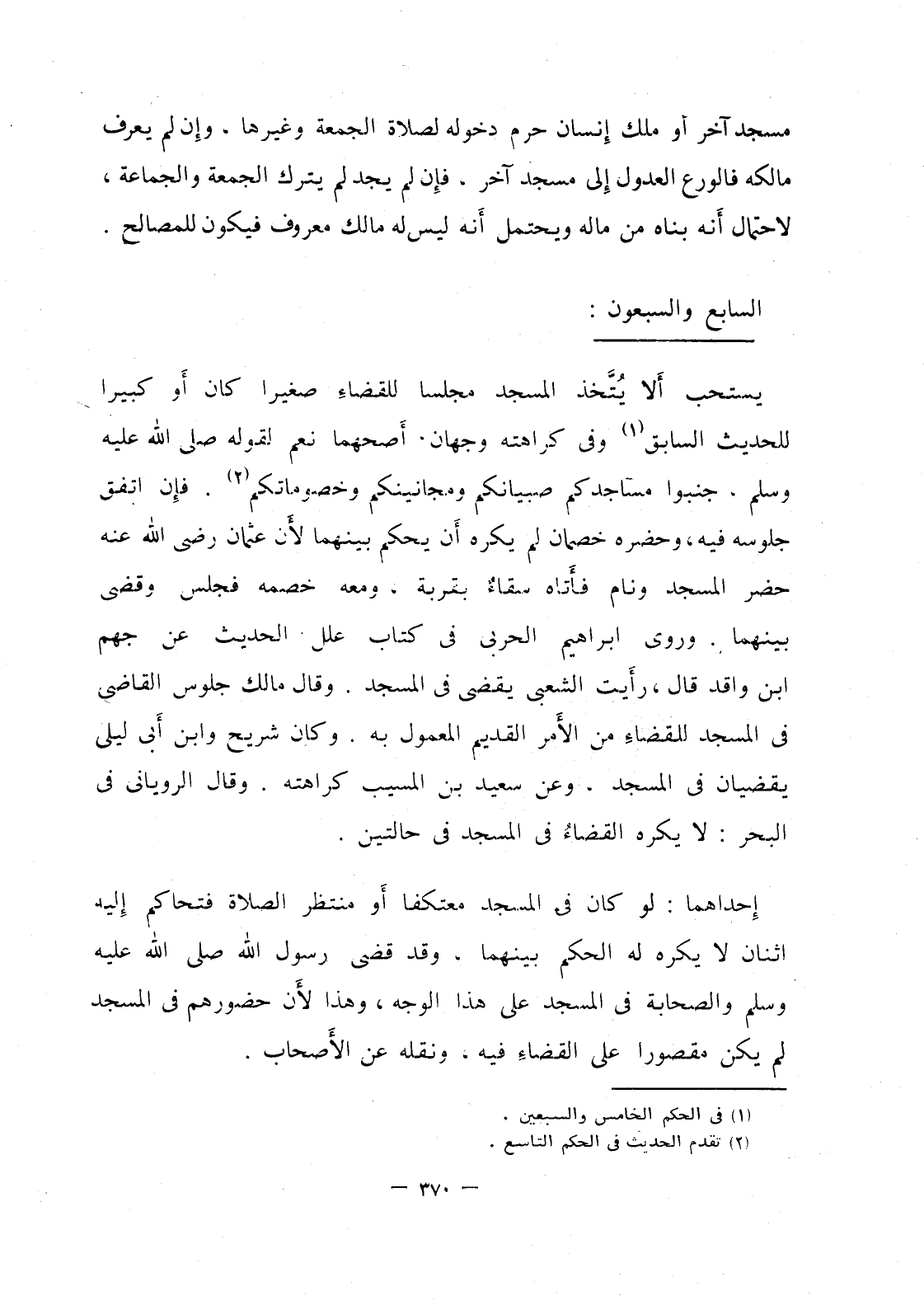يستحب ألا يتخذ المسجد مجلسا للقضاء صغيرا كان أو كبيرا للحديث السابق وفي كراهته وجهان، أصحهما نعم لقوله صلى الله عليه وسلم، جنبوا مساجدكم صبيانكم ومجانينكم وخصوماتكم، فإن اتفق جلوسه فيه، وحضره خصمان لم يكره أن يحكم بينهما لأن عثمان رضي الله عنه حضر المسجد ونام فأتاه سقاء بقربة، ومعه خصمه فجلس وقضى بينهما، وروى إبراهيم الحربي في كتاب علل الحديث عن جهم ابن واقد قال، رأيت الشعبي يقضي في المسجد، وقال مالك جلوس القاضي في المسجد للقضاء من الأمر القديم المعمول به، وكان شريح وانب ابي ليلى يقضيان في المسجد، وعن سعيد بن المسيب كراهته، وقال الروياني في البحر: لا يكره القضاء في المسجد في حالتين.
