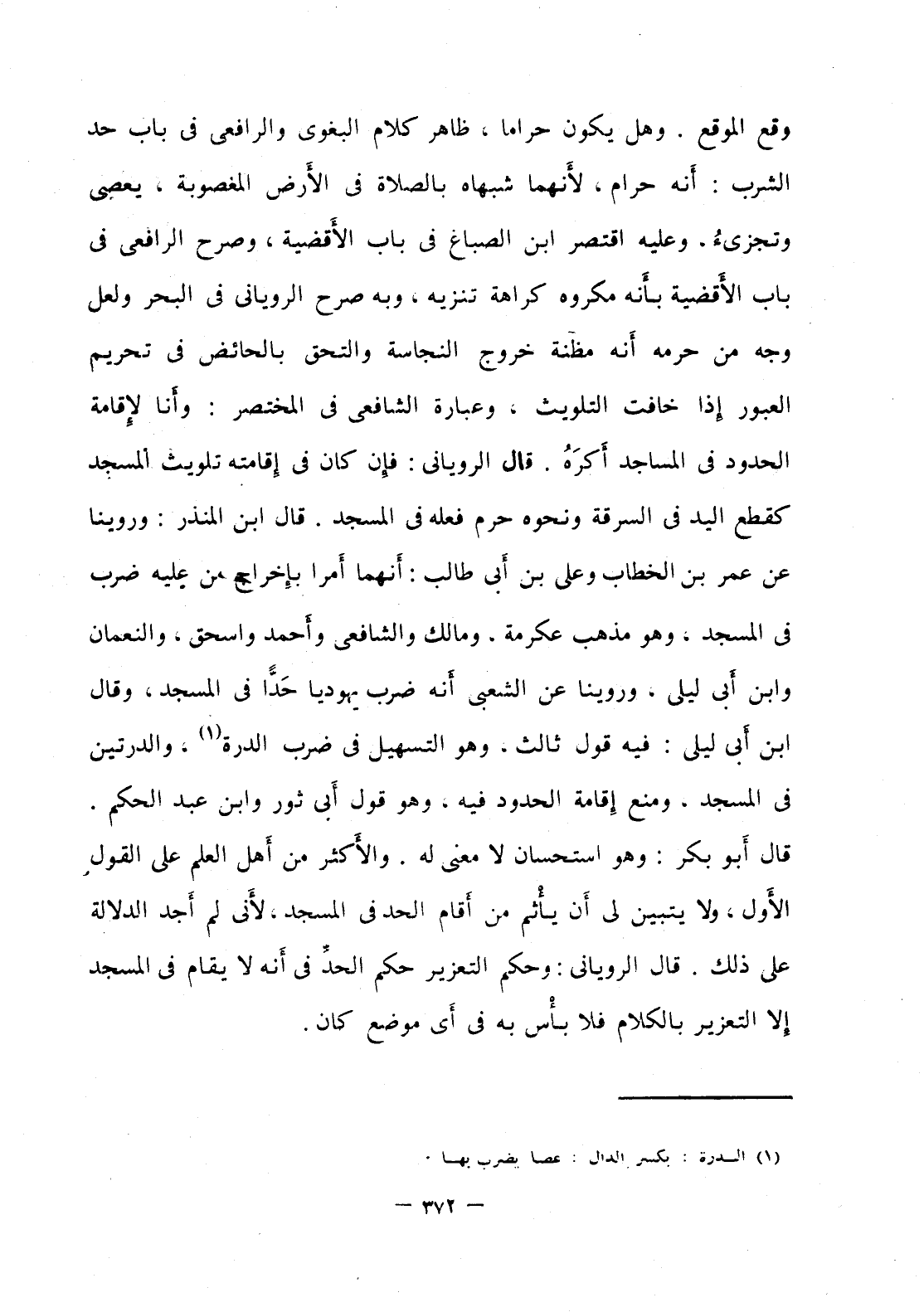 وقع الموقع، وهل يكون حراما، ظاهر كلام البغوي والرافعي في باب حد الشرب: أنه حرام، لأنهما شبهاه بالصلاة في الأرض المغصوبة، يعصي ويجزيء وعليه اقتصر ابن الصباغ في باب الأقضية، وصرح الرافعي في باب الأقضية بأنه مكروه كراهة تنزيه، وبه صرح الروياني في البحر ولعل وجه من حرمه أنه مظنة خروج النجاسة والتحق بالحائض في تحريم العبور إذا خافت التلويث، وعبارة الشافعي في المختصر، وأنا لإقامة الحدود في المساجد أكره، قال الروياني: فإن كان في إقامته تلويث المسجد كقطع اليد في السرقة ونحوه حرام فعله في المسجد، قال ابن المنذر: ورينا عن عمر بن الخطاب وعلى ابن طالب، أنهما أمرا بإخراج من عليه ضرب في المسجد، وهو مذهب عكرمة، ومالك والشافعي وأحمد وإسحاق، والنعمان وابن أبي ليلى، وروينا عن الشعبي أنه ضرب يهوديا حدا في المسجد، وقال ابن أبي ليىل، فيه قول ثالث: وهو التسهيل في ضرب الدرة، والدرتين في المسجد، ومنع إقامة الحدود فيه، وهو قول أبي ثور وابن عبد الحكم قال أبو بكر: وهو استحسان لا معنى له. والأكثر من أهل العلم على القول الأول، ولا يتبين لي أن يأثم من اقام الحد في المسجد لأني لم أجد الدلالة على ذلك، قال الروياني، وحكم التعزير حكم الحد في أنه لا يقام في المسجد إلا التعزير بالكلام فلا بأس به في أي موضع كان.