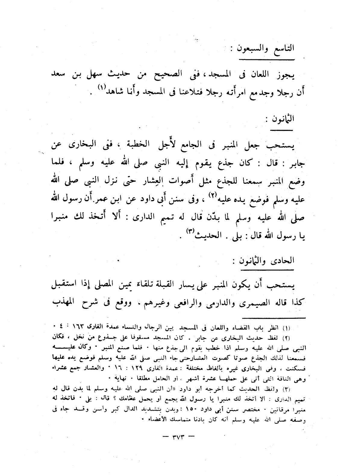 يستحب جعل المنبر في الجامع لأجل الخطبة، ففي البخاري عن جابر: قال كان جذع يقوم إليه النبي صلى الله عليه وسلم، فلما وضع المنبر سمعنا للجذع مثل أصوات العشار حتى نزل النبي صلى الله عليه وسلم فوضع يده عليه، وفي سنن أبي داود عن ابن عمر أن رسول الله صلى الله عليه وسلم لما بدن قال له تميم الداري: ألا أتخذ لك منبرا يارسول الله: بلى، الحديث.
