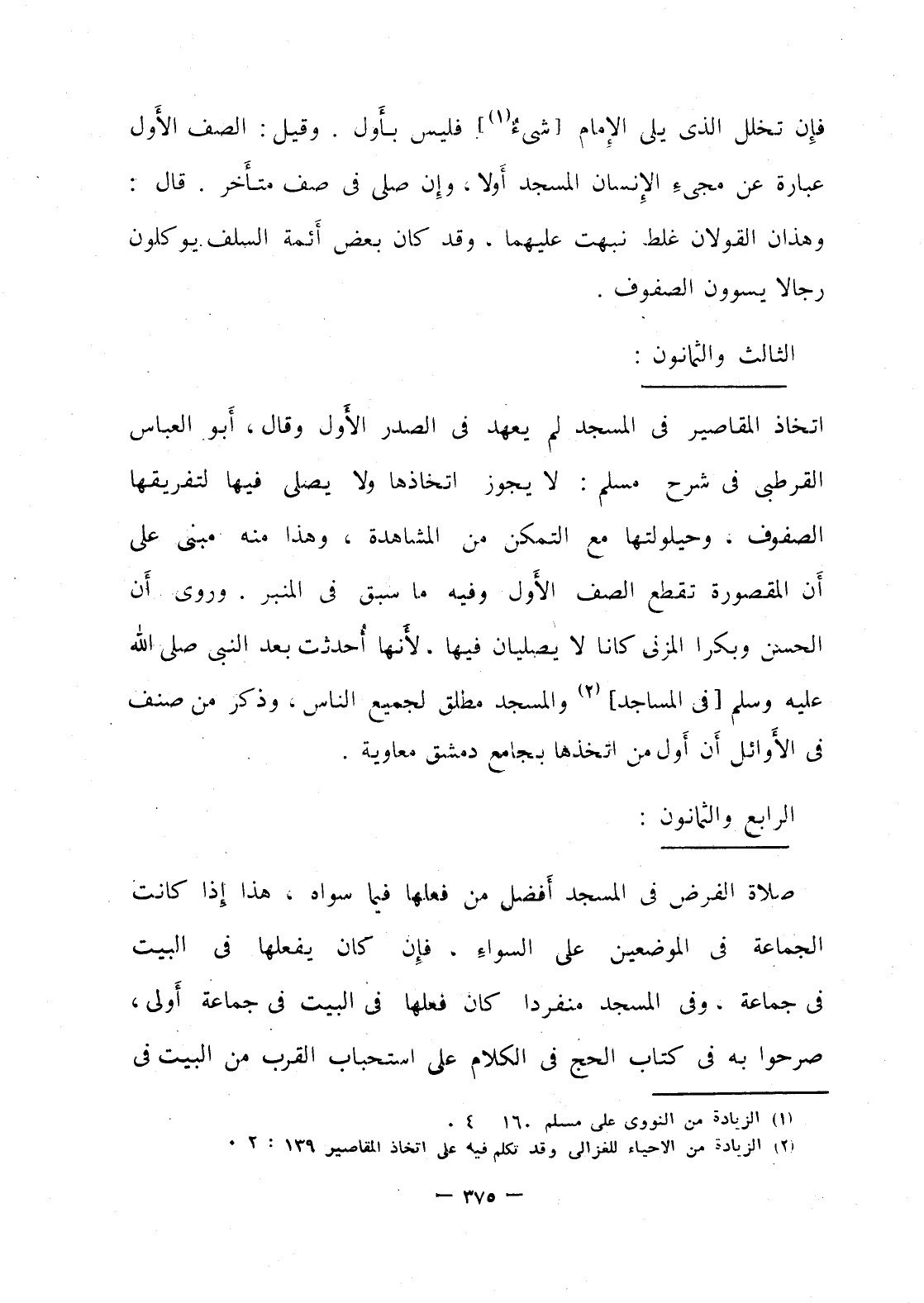 فإن تخلل الذي يلي الإمام [شيء] فليس بأول، وقيل الصف الأول عبارة عن مجيء الإنسان المسجد أولا، وإن صلى في صف متأخر، قال: وهذا القولان غلط نبهت عليهما، وقد كان بعض ائمة السلف يوكلون رجالا يسوون الصفوف.