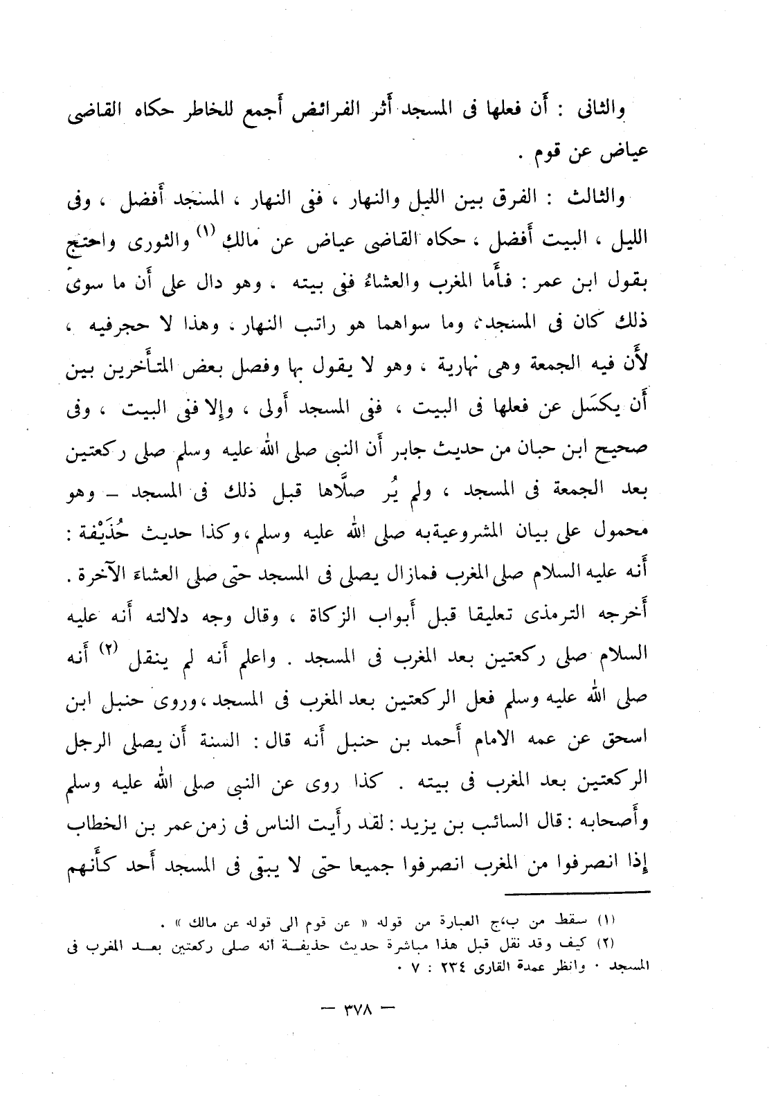 والثالث: الفرق بين الليل والنهار، ففي النهار، المسجد أفضل، وفي الليل البيت افضل، حكاه القاضي عياض عن مالك، والثوري واحتج بقول ابن عمر: فأما المغرب والعشاء ففي بيته، وهو دال على أن ما سوى ذلك كان في المسجد، وما سواهما هو راتب النهار، وهذا لا حجر فيه، لأن فيه الجمعة وهي نهارية، وهو لا يقول بها وفصل بعض المتأخرين بين أن يكسل عن فعلها في البيت، ففي المسجد أولى، وإلا ففي البيت، وفي صحيح ابن حبان من حديث جابر أن النبي صلى الله عليه وسلم صلى ركعتين بعد الجمعة في المسجد، ولم ير صلاها قبل ذلك في المسجد – وهو محمول على بيان المشروعية به صلى الله عليه وسلم، وكذا حديث حذيفة: أنه عليه السلام صلى المغرب فمازال يصلي في المسجد حتى صلى العشاء الآخرة. أخرجه الترمذي تعليقا قبل أبواب الزكاة، وقال وجه دلالته أنه عليه السلام صلى ركعتين بعد المغرب في المسجد، واعلم أنه لم ينقل أنه صلى الله عليه وسلم فعل الركعتين بعد المغرب في المسجد، وروى حنبل ابن اسحاق عن معه الامام أحمد بن حنبل أنه قال: السنة ان يصلي الرجل الركعتين بعد المغرب في بيته، كذا روى عن النبي صلى الله عليه وسلم وأصحابه، قال السائب بن يزيد: لقد رأيت الناس في زمن عمر بن الخطاب إذا انصرفوا من المغرب انصرفوا جميعا حتى لا يبقي في المسجد أحد كأنهم