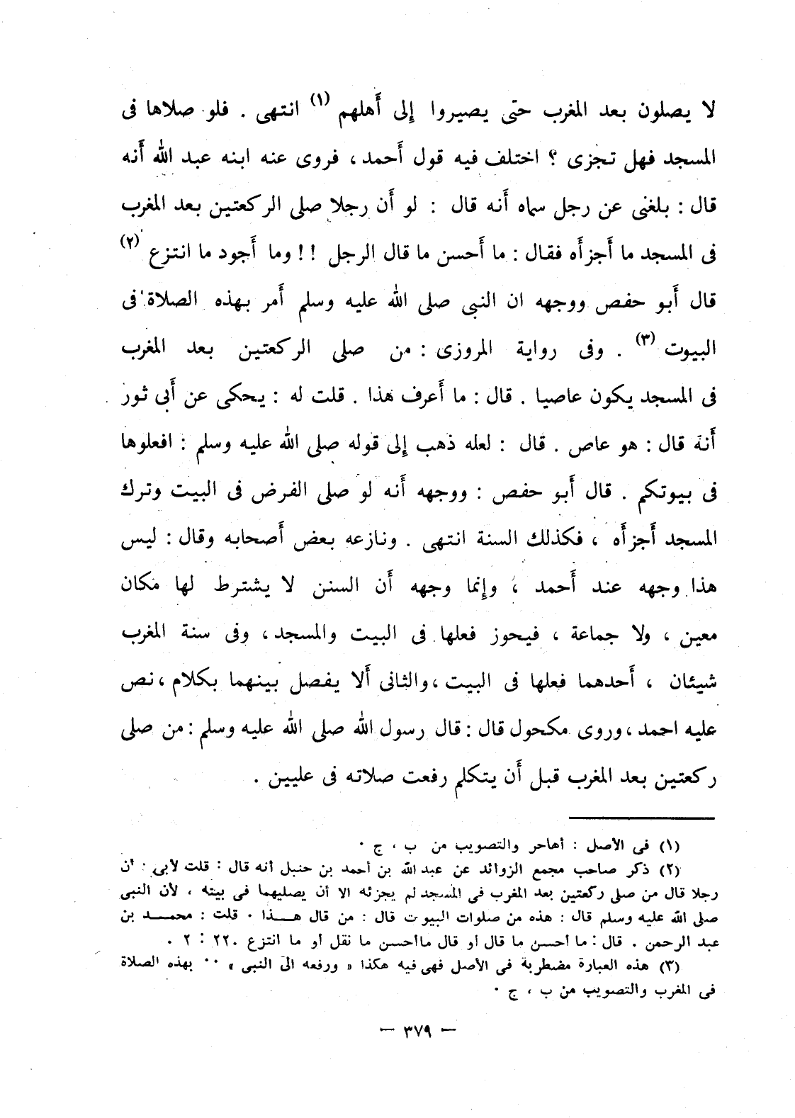 لا يصلون بعد المغرب حتي يصيروا إلى أهلهم انتهى، فلو صلاها في المسجد فهل تجزي، اختلف فيه قول أحمد، فروى عنه ابنه عبد الله أنه قال: بلغني عن رجل سماه أنه قال: لو أن رجلا صلى الركعتين بعد المغرب في المسجد ما أجزأه فال: ما أحسن ما قال الرجل، وما أجود ما انتزع قال أبو حفص ووجهه أن النبي صلى الله عليه وسلم أمر بهذه الصلاة في البيوت، وفي رواية المروزي، من صلى الركعتين بعد المغرب في المسجد يكون عاصيا، قال: ما أعرف هذا، قلت له: يكي عن ابي ثور أنه قال هو عاص، قال: لعله ذهب إلى قوله صلى الله عليه وسلم: افعلوها في بيوتكم، قال أبو حفص: ووجهه أنه لو صلى الفرض في البيت وترك المسجد أجزأه، فكذلك السنة انتهى، ونازعه بعض أصحابه وقال: ليس هذا وجهه عند أحمد، وإنما وجهه أن السنن لا يشترط لها مكان معين ولا جماعة فيجوز فعلها في البيت والمسجد، وفي سنة المغرب شيئان أحدهما فعلها في البيت، والثاني ألا يفصل بينهما بكلام نص عليه أحمد وروى مكحول قال: قال رسول الله صلى الله عليه وسلم/ من صلى ركعتين بعد المغرب قبل أن يتكلم رفعت صلاته في عليين.