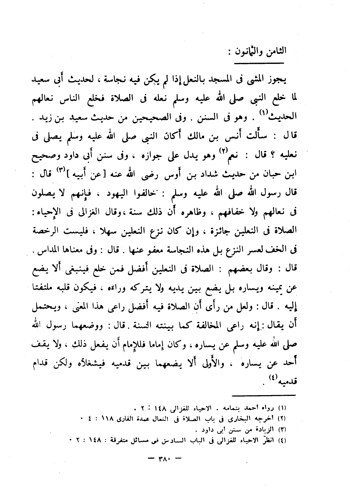 يجوز المشي في المسجد بالنعل إذا لم يكن فيه نجاسة، لحديث أبي سعيد لما خلع النبي صلى الله عليه وسلم نعله في الصلاة فخلع الناس نعالهم الحديث، وهو في السنن: وفي الصحيحين من حديث سعيد بن زيد، قال: سألت أنس بن مالك أكان النبي صلى الله عليه وسلم يصلي في نعليه قال: نعم، وهو يدل على جوازه، وفي سنن أبي داود وصحيح ابن حبان من حديث شداد بن أوس رضي الله عنه [عن أبيه] قال: قال رسول الله صلى الله عليه وسلم: خالفوا اليهود، فإنهم لا يصلون في نعالهم ولا خفافهم، وظاهره أن ذلك سنة، وقال الغزالي في الإحياء الصلاة في النعلين جائزة، وإن كان نزع النعلين سهلا، فليست الرخصة في الخف لعسر النزع بل هذه النجاسة معفو عنها، قال: وفي معناها المداس قال: وقال بعضهم: الصلاة في النعلين أفضل فمن خلع فينبغي ألا يضع عن يمينه ويساره بل يضع بين يديه ولا يتركه وراءه، فيكون قلبه ملتفتا إليه، قال: ولعل من رأي أن الصلاة فيه أفضل راعي هذا المعنى، ويحتمل أنه يقال: إنه راعى المخالفة كما بينته السنة، قال: ووضعهما، رسول الله صلى الله عليه وسلم عن يساره، وكان إماما فللإمام أن يفعل ذلك، ولا يقف أحد عن يساره، والأولى ألا يضعهما بين قدميه فيشغلاه ولكن قدام قدميه.