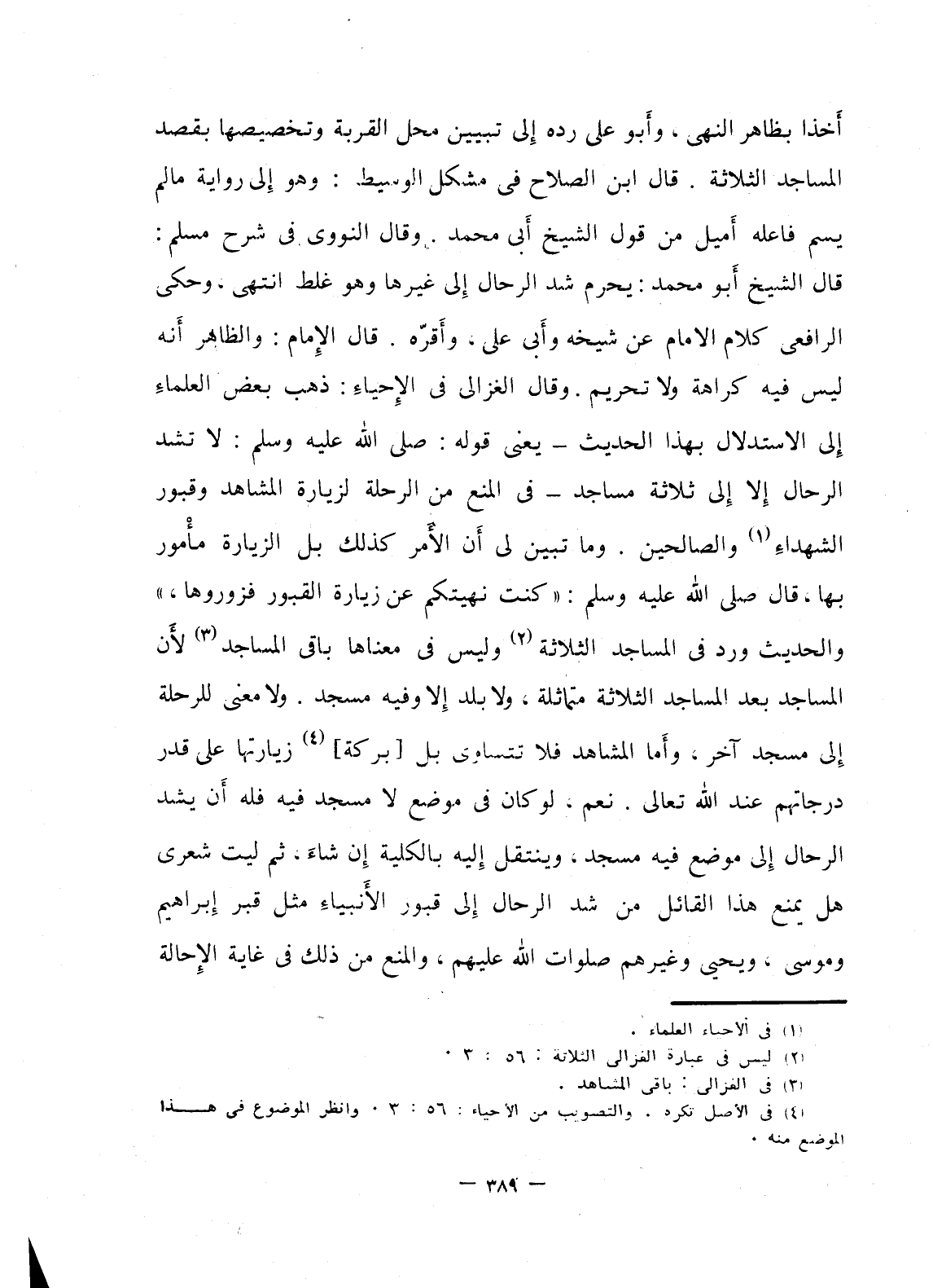 أخذا بظاهر النهي، وأبو علي رده إلى تبيين محل القربة وتخصيصها بقصد المساجد الثلاثة، قال ابن الصلاح في مشكل الوسيط، وهو إلى رواية ما لم يسم فاعله أميل من قول الشيخ ابي محمد. وقال النووي في شرح مشلم: قال الشيخ أبو محمد: يحرم شد الرحال إلى غيرها وهو غلط انتهى، وحكي الرافعي كلام الامام عن شيخه وأبي علي، وأقره، قال الامام والظاهر أنه ليس فيه كراهة ولا تحريم، وقال الغزالي في الإحياء، ذهب بعض العلماء إلى الاستدال بهذا الحديث – يعني قوله: صلى الله عليه وسلم: لا تشد الرحال إلا إلى ثلاثة مساجد - في المنع من الرحلة لزيارة المشاهد وقبور الشهداء والصالحين، وما تبين لي أن الأمر كذلك بل الزيارة مأمور بها قال صلى الله عليه وسلم: كنت نهيتكم عن زيارة القبور فزوروها، والحديث ورد في المساجد الثلاثة وليس في معناها باقي المساجد لأن المساجد بعد المساجد الثلاثة متماثلة، ولا بلد إلا وفيه مسجد، ولا معنى للرحلة إلى مسجد آخر، واما المشاهد فلا تتساوي بل [بركة] زيارتها على قدر درجاتهم عند الله تعالى، نعم، لو كان في موضع لا مسجد فيه فله أن يشد الرحال إلى موضع فيه مسجد، وينتقل إليه بالكلية إن شاء ثم ليت شعري هل يمنع هذا القائل من شد الرحال، إلى قبور الانبياء مثل قبر إبراهيم وموسي، ويحيى وغيرهم صلوات الله عليهم، والمنع من ذلك في غاية الإحالة