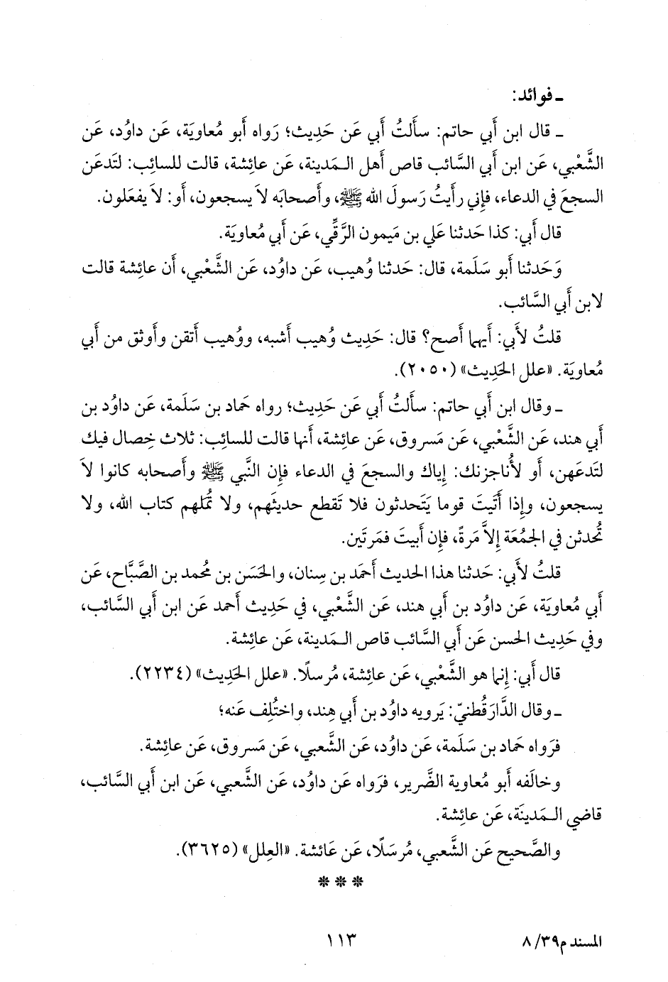- وقال ابن أبي حاتم: سألتُ أبي عن حديثٍ؛ رواه حماد بن سلمة، عن داود بن أبي هند، عن الشعبي، عن مسروق، عن عائشة، أنها قالت للسائب: ثلاث خصال فيك لتدعهن، أو لأناجزنك: إياك والسجع في الدعاء فإن النبي صَلى الله عَليه وسَلم وأصحابه كانوا لا يسجعون، وإذا أتيت قوما يتحدثون فلا تقطع حديثهم، ولا تملهم كتاب الله، ولا تحدثن في الجمعة إلا مرة، فإن أبيت فمرتين.