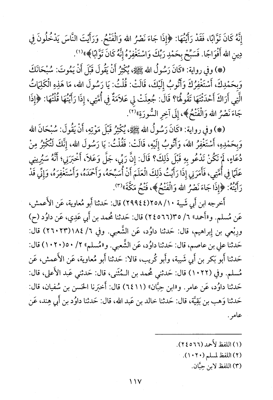- وفي رواية: «كان رسول الله صَلى الله عَليه وسَلم يكثر قبل موته، أن يقول: سبحان الله وبحمده، أستغفر الله، وأتوب إليه، قالت: فقلت: يا رسول الله، إنك لتكثر من دعاء، لم تكن تدعو به قبل ذلك؟ قال: إن ربي، جل وعلا، أخبرني؛ أنه سِيريني علما في أمتي، فأمرني إذا رأيت ذلك العلم أن أسبحه، وأحمده، وأستغفره، وإني قد رأيته: {إذا جاء نصر الله والفتح}، فتح مكة» (¬١).