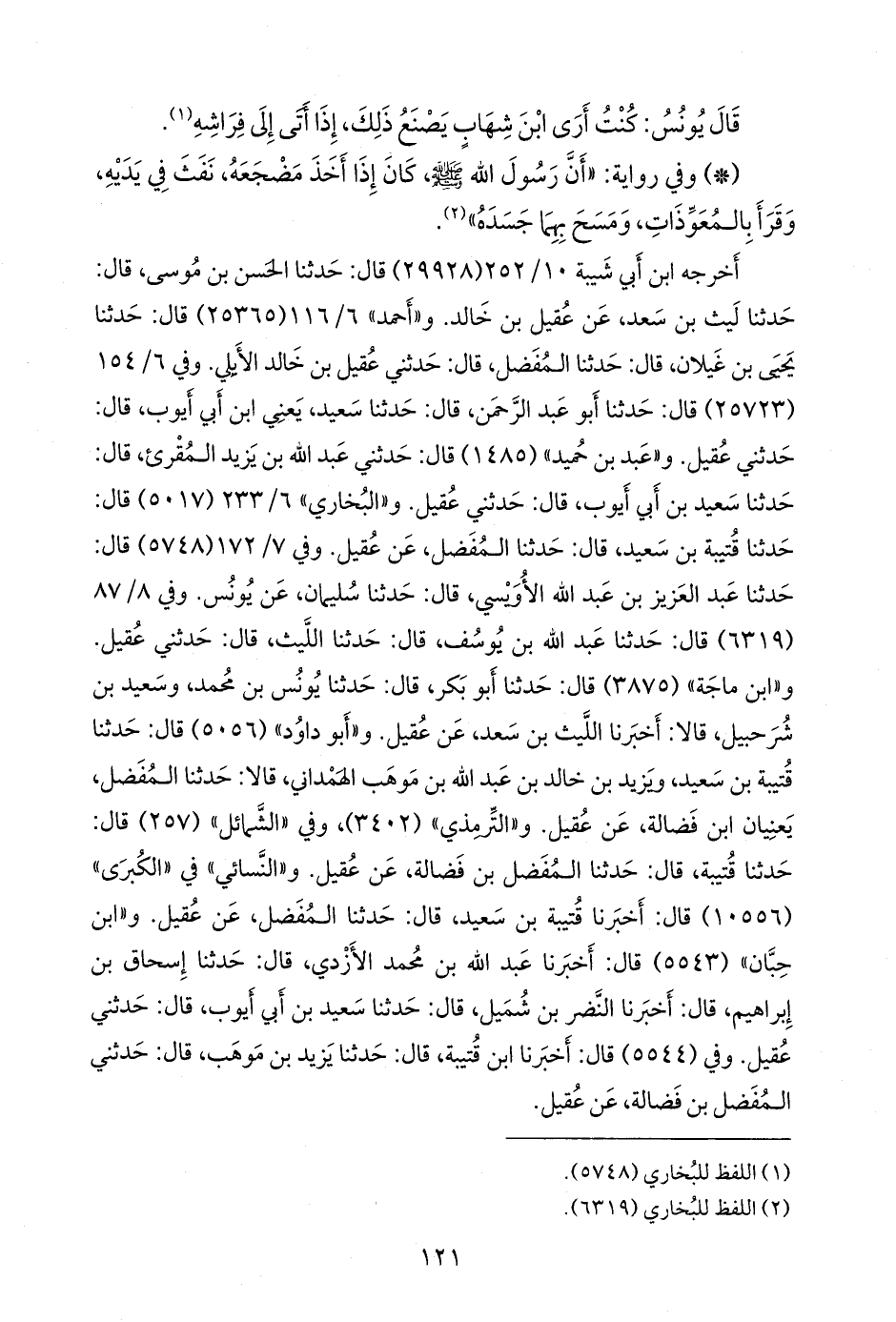 وفي ٦/ ١٥٤ (٢٥٧٢٣) قال: حدثنا أَبو عبد الرَّحمَن, قال: حدثنا سعيد، يعني ابن أبي أيوب، قال: حدثني عقيل. و «عَبد بن حُميد» (١٤٨٥) قال: حدثني عبد الله بن يزيد المُقرِئ, قال: حدثنا سعيد بن أبي أيوب، قال: حدثني عقيل. و «البخاري» ٦/ ٢٣٣ (٥٠١٧) قال: حدثنا قتيبة بن سعيد, قال: حدثنا المفضل، عن عقيل. وفي ٧/ ١٧٢ (٥٧٤٨) قال: حدثنا عبد العزيز بن عبد الله الأويسي, قال: حدثنا سليمان، عن يونس. وفي ٨/ ٨٧ (٦٣١٩) قال: حدثنا عبد الله بن يوسف, قال: حدثنا الليث، قال: حدثني عُقَيل. و «ابن ماجة» (٣٨٧٥) قال: حدثنا أَبو بكر, قال: حدثنا يونس بن محمد، وسعيد بن شرحبيل, قالا: أخبرنا الليث بن سعد، عن عقيل. و «أَبو داود» (٥٠٥٦) قال: حدثنا قتيبة بن سعيد، ويزيد بن خالد بن عبد الله بن مَوهَب الهمداني, قالا: حدثنا المفضل، يعنيان ابن فضالة، عن عقيل. و «التِّرمِذي» (٣٤٠٢)، وفي «الشمائل» (٢٥٧) قال: حدثنا قتيبة, قال: حدثنا المُفَضَّل بن فَضالة، عن عقيل. و «النَّسَائي» في «الكبرى» (١٠٥٥٦) قال: أخبرنا قتيبة بن سعيد, قال: حدثنا المفضل، عن عقيل. و «ابن حِبَّان» (٥٥٤٣) قال: أخبرنا عبد الله بن محمد الأزدي، قال: حدثنا إسحاق بن إبراهيم، قال: أخبرنا النضر بن شميل، قال: حدثنا سعيد بن أبي أيوب، قال: حدثني عقيل. وفي (٥٥٤٤) قال: أخبرنا ابن قتيبة، قال: حدثنا يزيد بن مَوهَب، قال: حدثني المُفَضَّل بن فَضالة، عن عقيل.