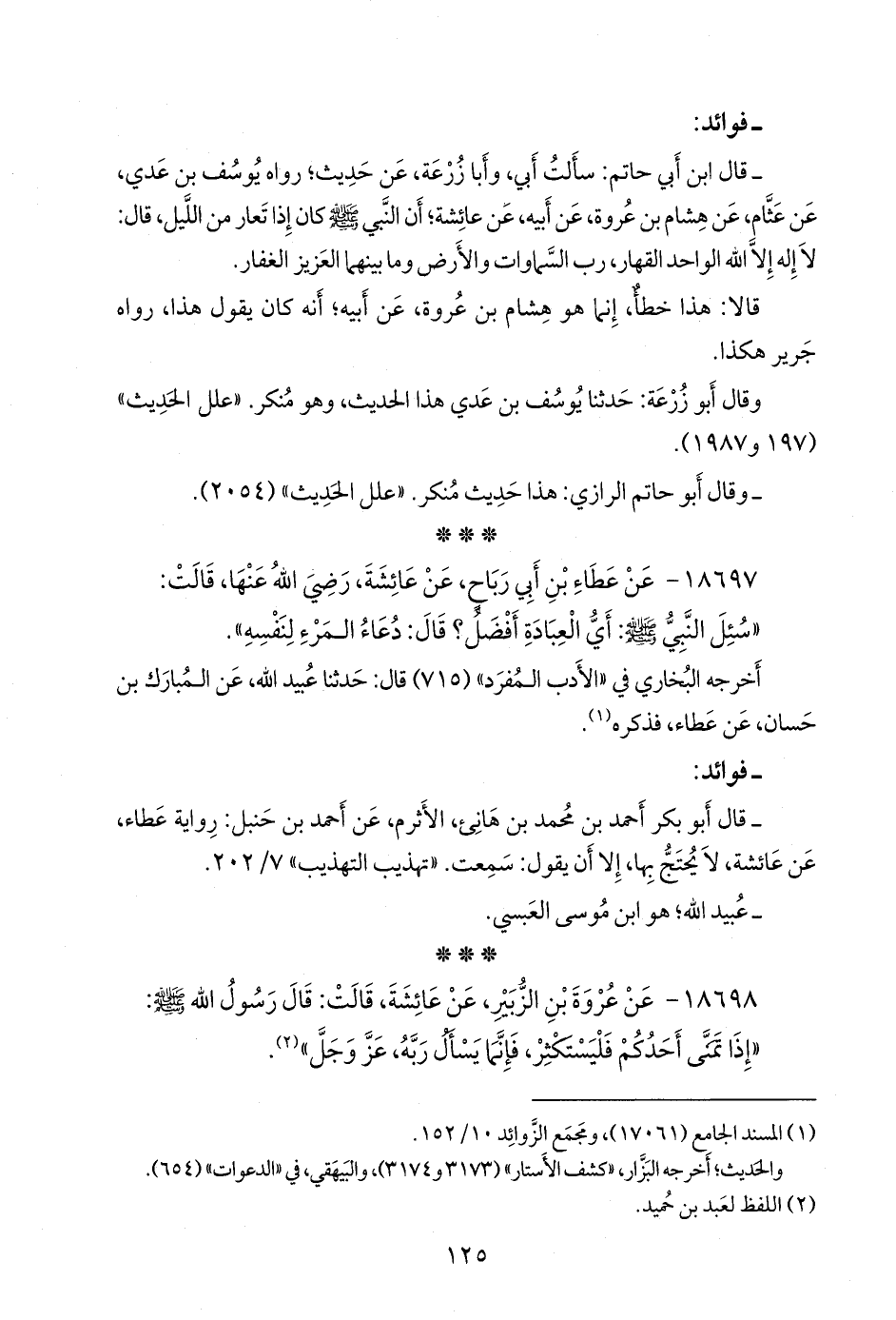 - قال عبد الرَّحمَن بن أبي حاتم الرازي: سألت أبي، وأَبا زُرعَة، عن حديث؛ رواه يوسف بن عَدي، عن عثام، عن هشام بن عروة، عن أبيه، عن عائشة؛ أن النبي صَلى الله عَليه وسَلم كان إذا تعار من الليل، قال: لا إله إلا الله الواحد القهار، رب السماوات والأرض وما بينهما العزيز الغفار.