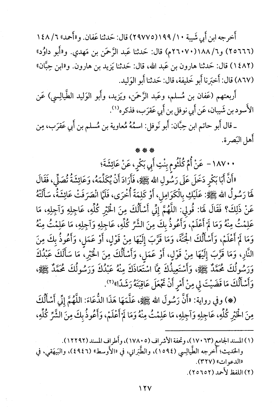 - وفي رواية: «أن رسول الله صَلى الله عَليه وسَلم علمها هذا الدعاء: اللهم إني أسألك من الخير كله، عاجله وآجله، ما علمت منه وما لم أعلم، وأعوذ بك من الشر كله،