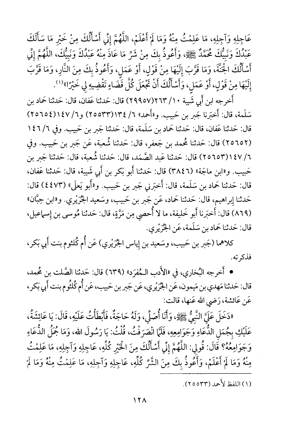 «دخل علي النبي صَلى الله عَليه وسَلم وأنا أصلي، وله حاجة، فأبطات عليه، قال: يا عائشة، عليك بجمل الدعاء وجوامعه، فلما انصرفت، قلت: يا رسول الله، وما جمل الدعاء وجوامعه؟ قال: قولي: اللهم إني أسألك من الخير كله، عاجله وآجله، ما علمت منه وما لم أعلم، وأعوذ بك من الشر كله، عاجله وآجله، ما علمت منه وما لم