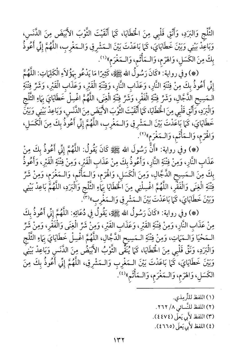- وفي رواية: «أن رسول الله صَلى الله عَليه وسَلم كان يقول: اللهم إني أعوذ بك من عذاب النار، ومن فتنة النار، وأعوذ بك من عذاب القبر، ومن فتنة القبر، وأعوذ بك من المسيح الدجال، ومن الكسل، والهرم، والماثم، والمغرم، ومن شر فتنة الغنى والفقر، اللهم اغسلني من الخطايا بماء الثلج والبرد، اللهم باعد بيني وبين خطاياي، كما باعدت بين المشرق والمغرب» (¬١).