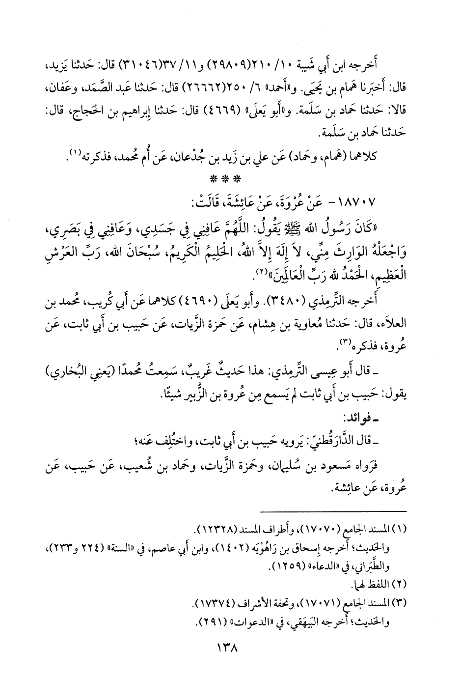 أخرجه التِّرمِذي (٣٤٨٠). وأَبو يَعلى (٤٦٩٠) كلاهما عن أبي كُريب, محمد بن العلاء، قال: حدثنا معاوية بن هشام، عن حمزة الزيات، عن حبيب بن أبي ثابت، عن عروة، فذكره (¬٢).
