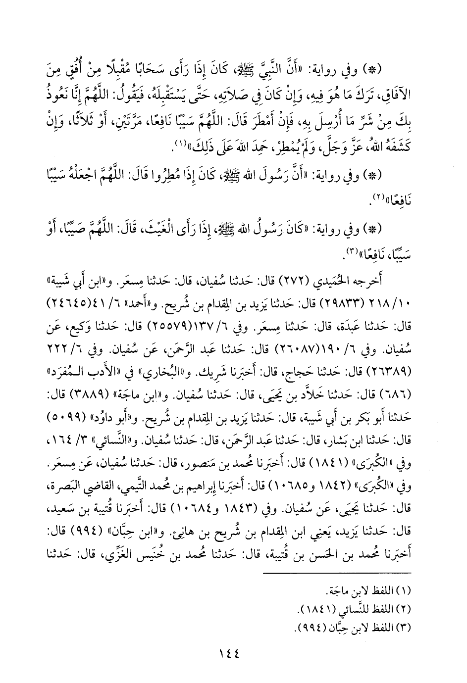 - وفي رواية: «كان رسول الله صَلى الله عَليه وسَلم إذا رأى الغيث، قال: اللهم صيبا، أو سيبا، نافعا» (¬٢).