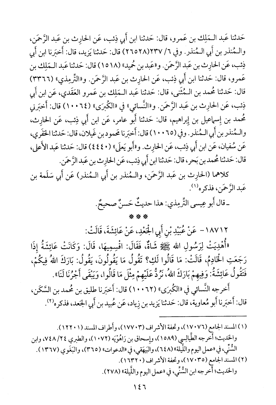 وفي ٦/ ٢٣٧ (٢٦٥٢٨) قال: حدثنا يزيد، قال: أخبرنا ابن أبي ذِئب، عن الحارث بن عبد الرَّحمَن. و «عَبد بن حُميد» (١٥١٨) قال: حدثنا عبد الملك بن عَمرو، قال: حدثنا ابن أبي ذِئب، عن الحارث بن عبد الرَّحمَن. و «التِّرمِذي» (٣٣٦٦) قال: حدثنا محمد بن المثنى, قال: حدثنا عبد الملك بن عَمرو العَقَدي، عن ابن أبي ذِئب، عن الحارث بن عبد الرَّحمَن. و «النَّسَائي» في «الكبرى» (١٠٠٦٤) قال: أخبرني محمد بن إسماعيل بن إبراهيم، قال: حدثنا أَبو عامر, عن ابن أبي ذِئب، عن الحارث، والمنذر بن أبي المنذر. وفي (١٠٠٦٥) قال: أخبرنا محمود بن غَيلان, قال: حدثنا الحَفَري، عن سفيان، عن ابن أبي ذِئب، عن الحارث. و «أَبو يَعلى» (٤٤٤٠) قال: حدثنا عبد الأعلى، قال: حدثنا محمد بن بحر، قال: حدثنا ابن أبي ذِئب، عن الحارث بن عبد الرَّحمَن.