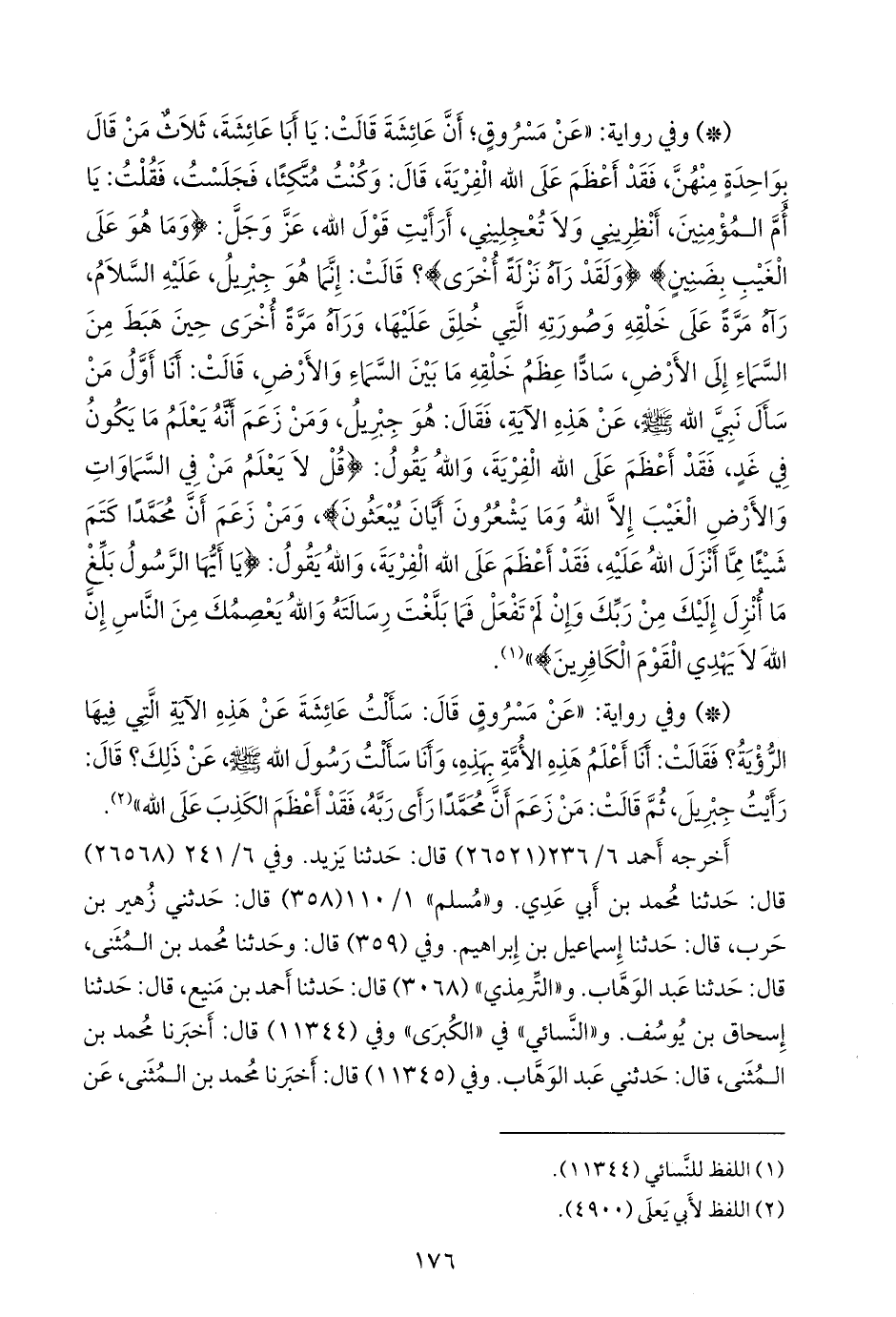 - وفي رواية: «عن مسروق؛ أن عائشة قالت: يا أبا عائشة، ثلاث من قال بواحدة منهن، فقد أعظم على الله الفرية، قال: وكنت متكئا، فجلست، فقلت: يا أُم المؤمنين، أنظريني ولا تعجليني، أرأيت قول الله، عز وجل: {وما هو على الغيب بضنين} {ولقد رآه نزلة أخرى}؟ قالت: إنما هو جبريل، عليه السلام، رآه مرة على خلقه وصورته التي خلق عليها، ورآه مرة أخرى حين هبط من السماء إلى الأرض، سادا عظم خلقه ما بين السماء والأرض، قالت: أنا أول من سأل نبي الله صَلى الله عَليه وسَلم عن هذه الآية، فقال: هو جبريل، ومن زعم أنه يعلم ما يكون في غد، فقد أعظم على الله الفرية، والله يقول: {قل لا يعلم من في السماوات والأرض الغيب إلا الله وما يشعرون أيان يبعثون}، ومن زعم أن محمدا كتم شيئًا مما أنزل الله عليه، فقد أعظم على الله الفرية، والله يقول: {يا أيها الرسول بلغ ما أنزل إليك من ربك وإن لم تفعل فما بلغت رسالته والله يعصمك من الناس إن الله لا يهدي القوم الكافرين}» (¬١).