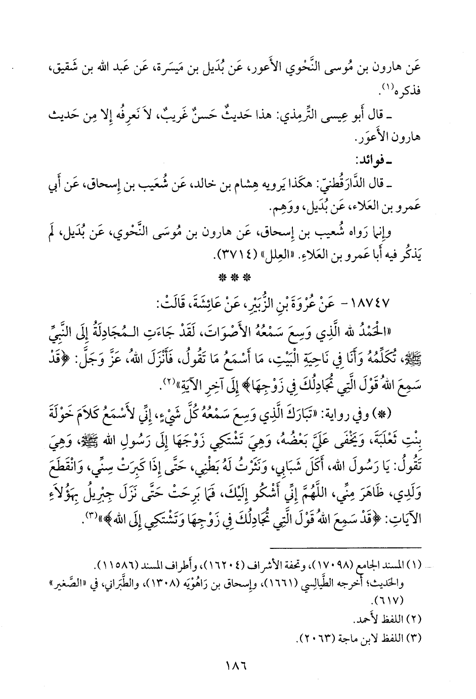 - وفي رواية: «الحمد لله الذي وسع سمعه الأصوات، لقد جاءت خولة إلى رسول الله صَلى الله عَليه وسَلم تشكو زوجها، فكان يخفى علي كلامها، فأنزل الله، عز وجل: {قد سمع الله قول التي تجادلك في زوجها وتشتكي إلى الله والله يسمع تحاوركما} الآية» (¬٣).
