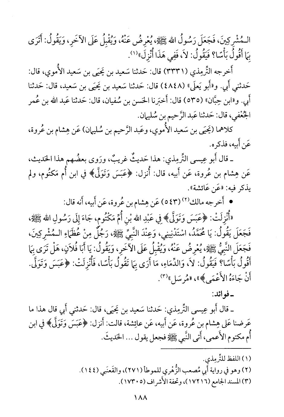- قال التِّرمِذي: حدثنا سعيد بن يحيى، قال: حدثني أبي قال هذا ما عرضنا على هشام بن عروة، عن أبيه، عن عائشة، قالت: أنزل: {عبس وتولى} في ابن أم مكتوم الأعمى، أتى النبي صَلى الله عَليه وسَلم فجعل يقول، الحديث.